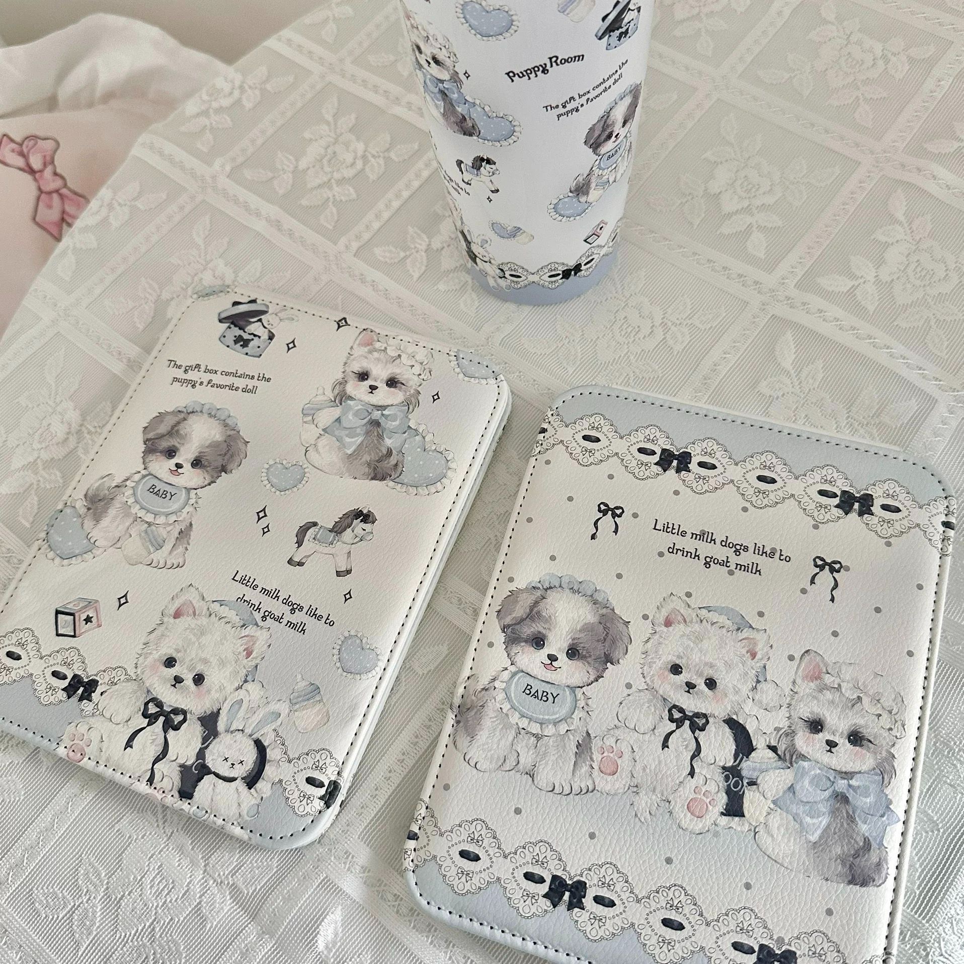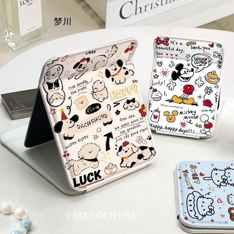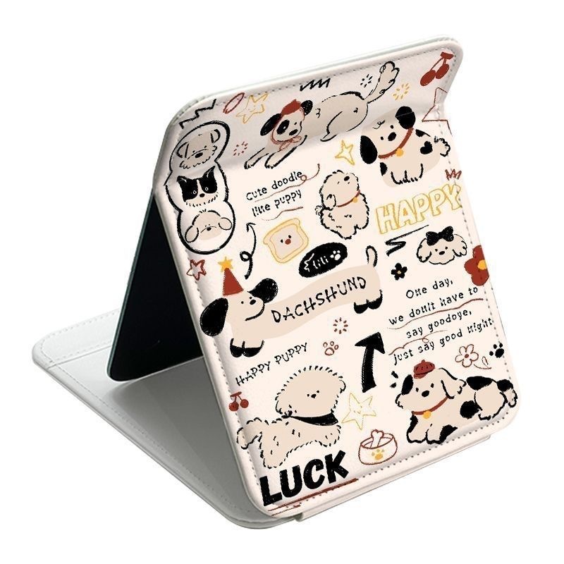 バレエスタイルブルー子犬折りたたみミラー化粧鏡puレザー素材防水両面パターンデザインミラー学生