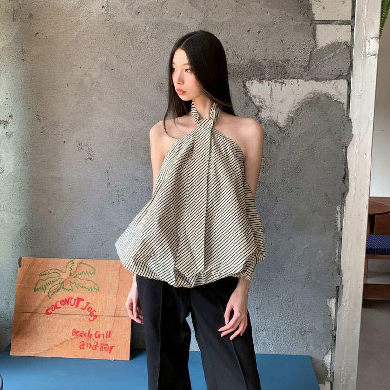条纹吊带女设计感小众挂脖领带露背辣妹花苞背心上衣2025夏季新款