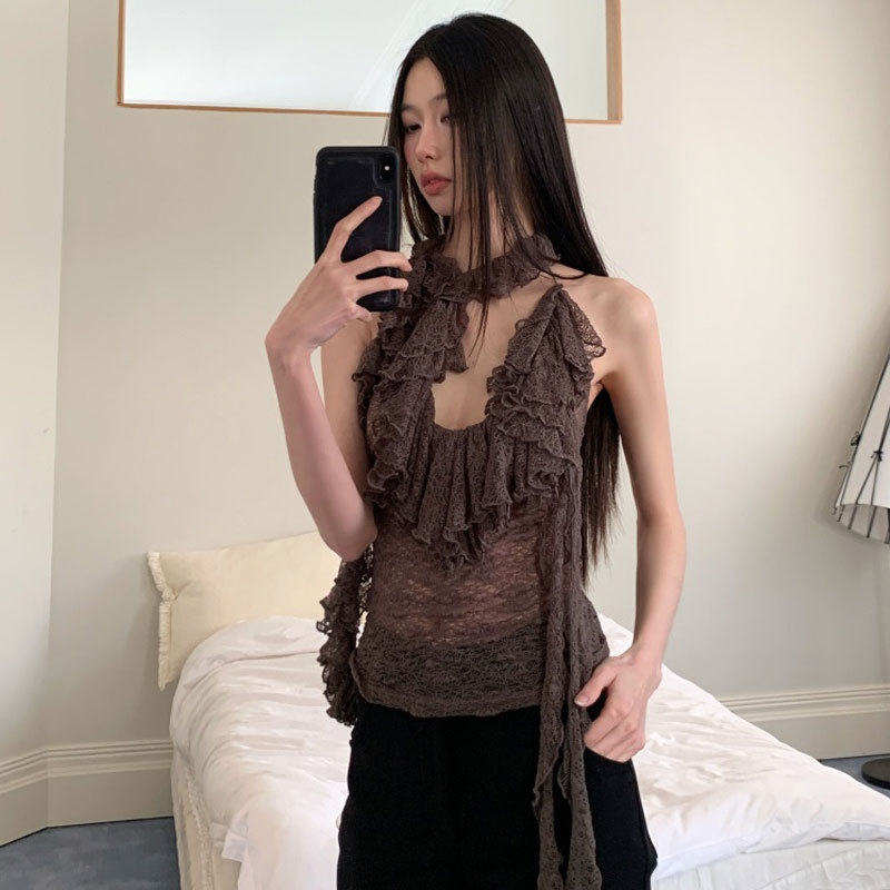 ギャルの連体服風露背上着春夏レースの中に身を修める感じのデザインの白いキャミソールの女性の外着