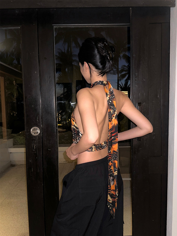 纯欲夏季款网纱上衣吊带背心女露肩法式复古印花内搭别致露背扭结