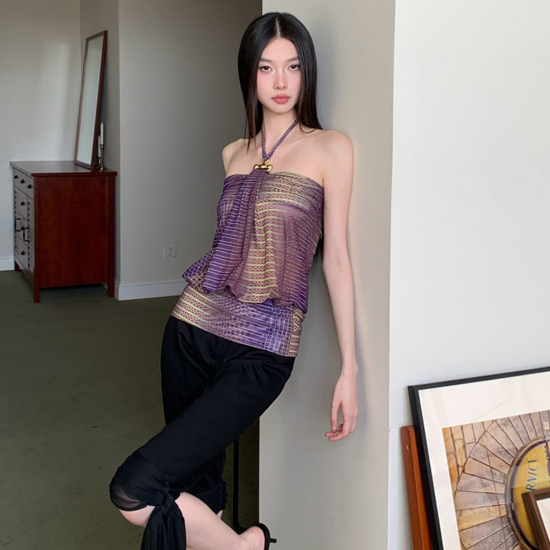 紫金色渐变背心女设计感小众挂脖格条纹辣妹吊带上衣2025夏季新款