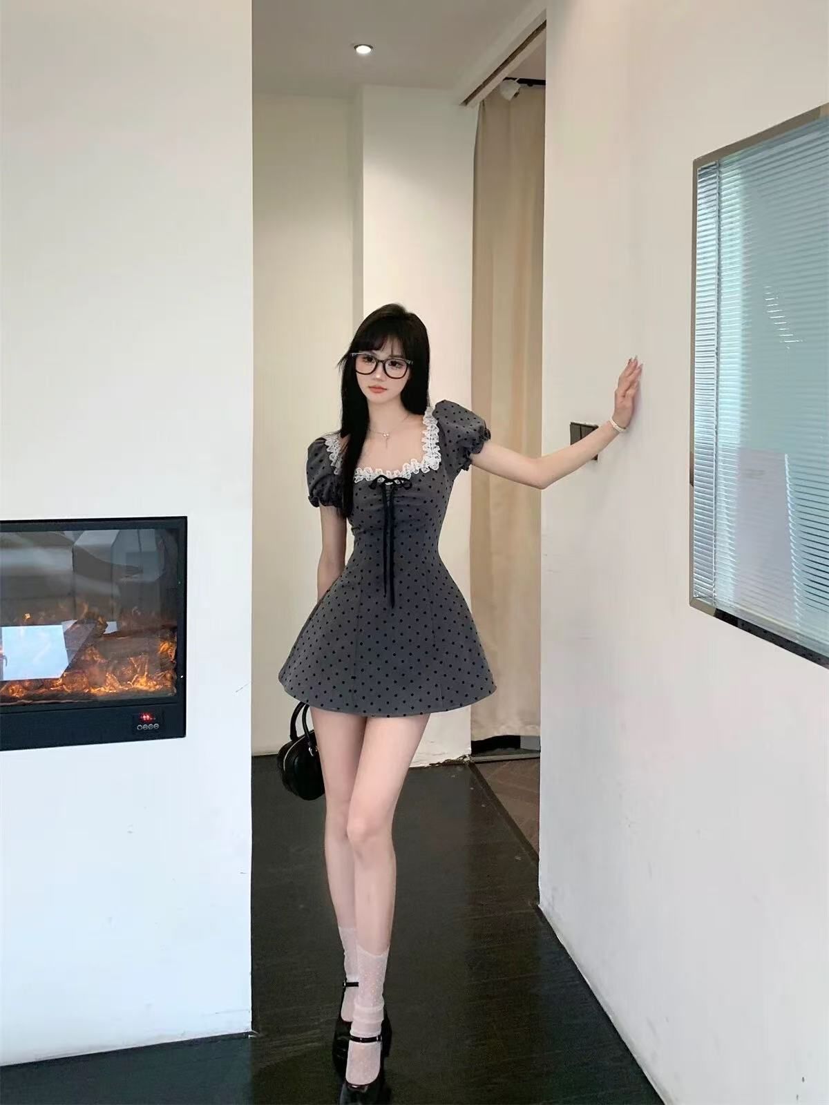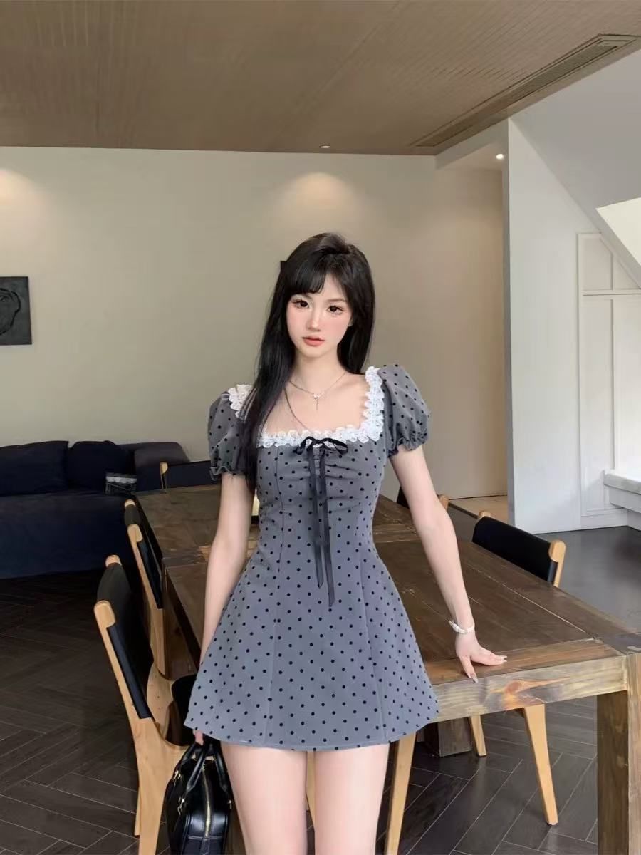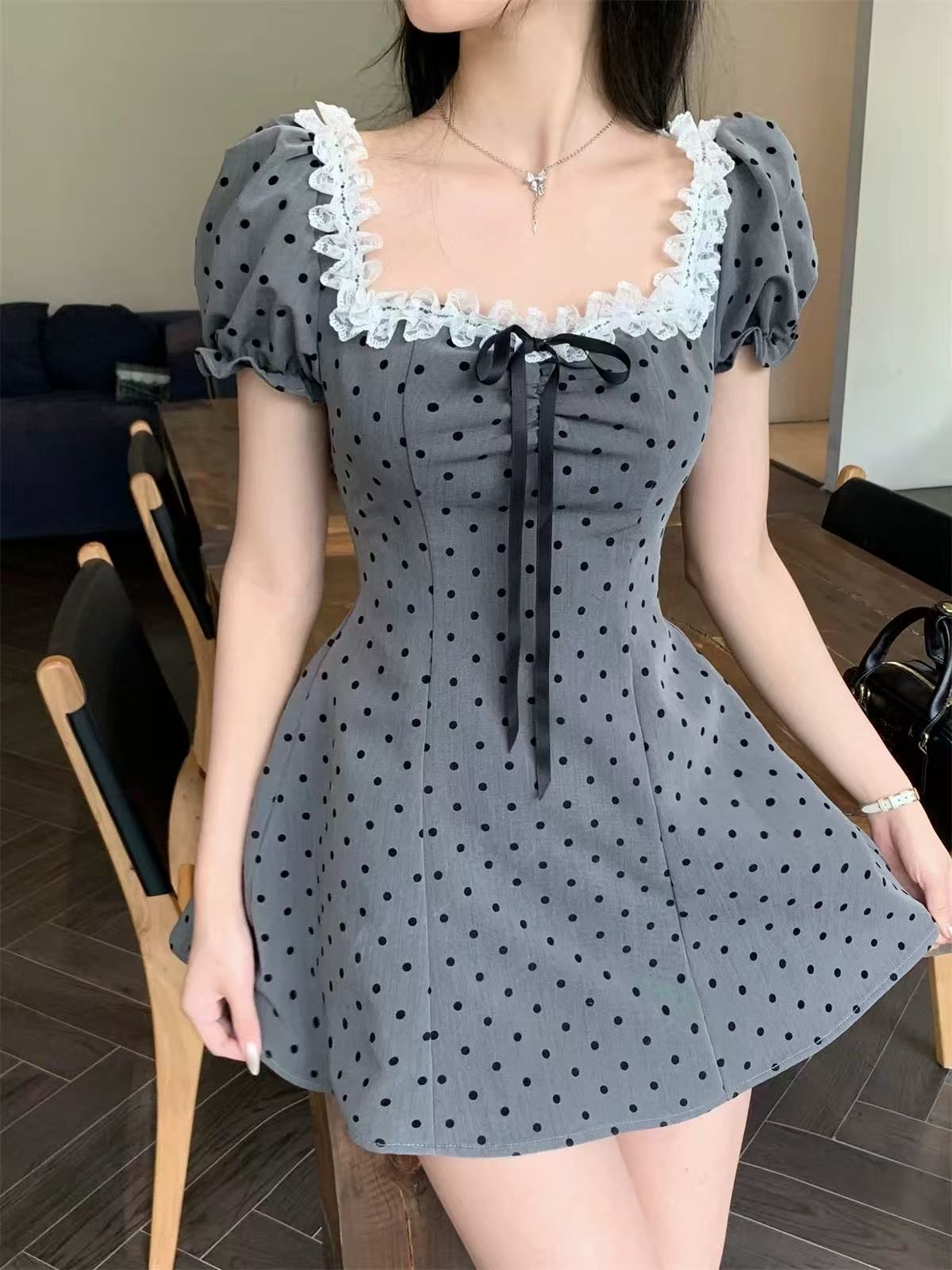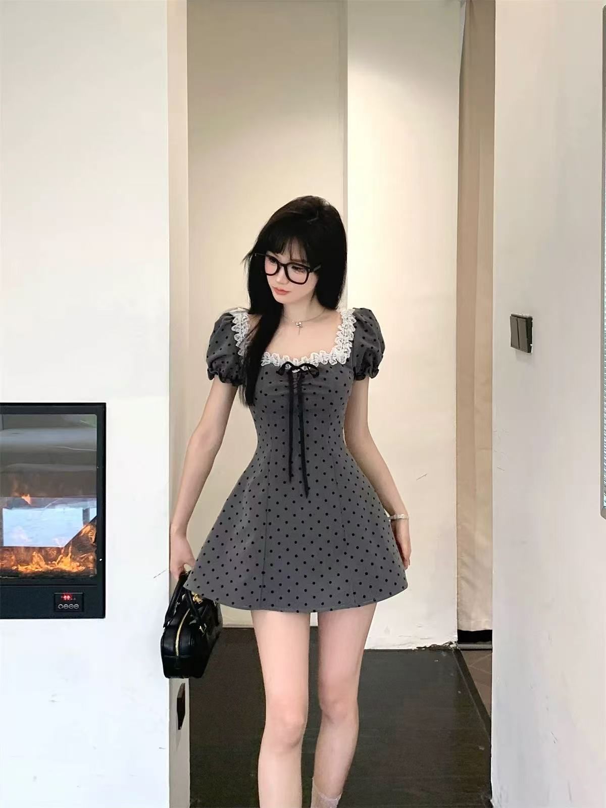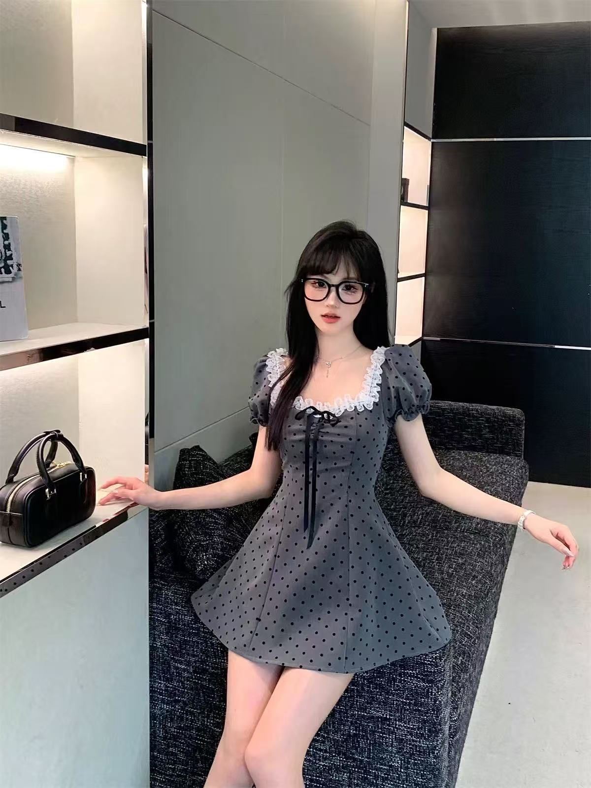 純欲iu系灰色の波点は腰の方の襟のワンピースの女性の夏の韓国版はやせている気質のA字のスカートを現します。