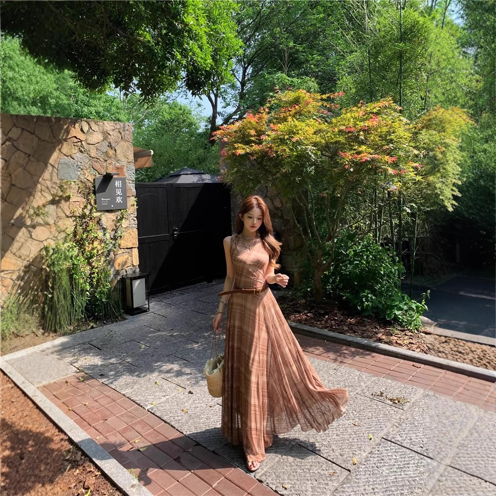 复古格纹无袖背心连衣裙女夏季气质修身大摆长裙显瘦收腰a字裙子