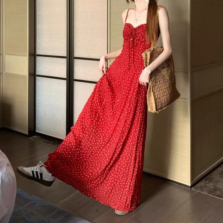 レトロな花のスカートの赤いワンピースの婦人服の夏のギャルのa字のスカートの子のサスペンダーのスカートのリゾート風の海辺のロングスカート