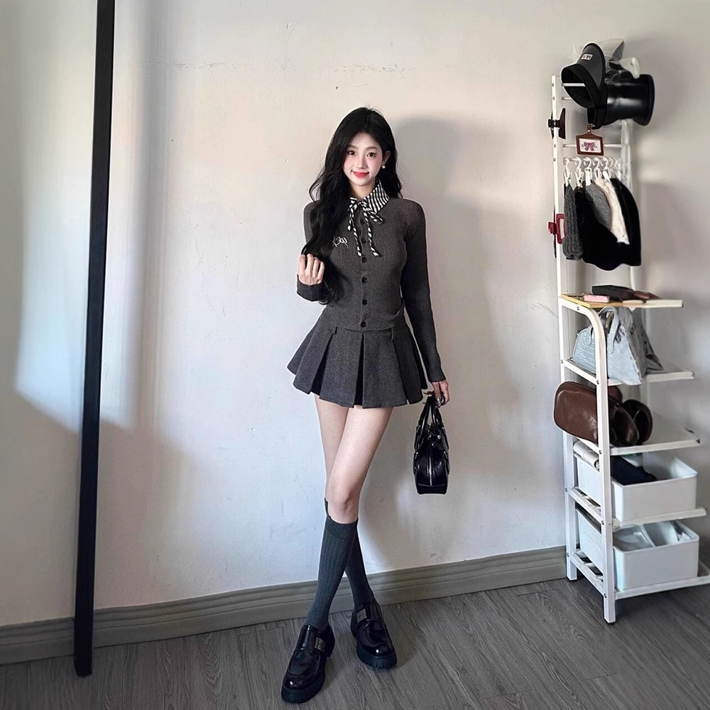 韩系学院小个子巨好看的秋装一整套假两件格子针织上衣百褶裙套装