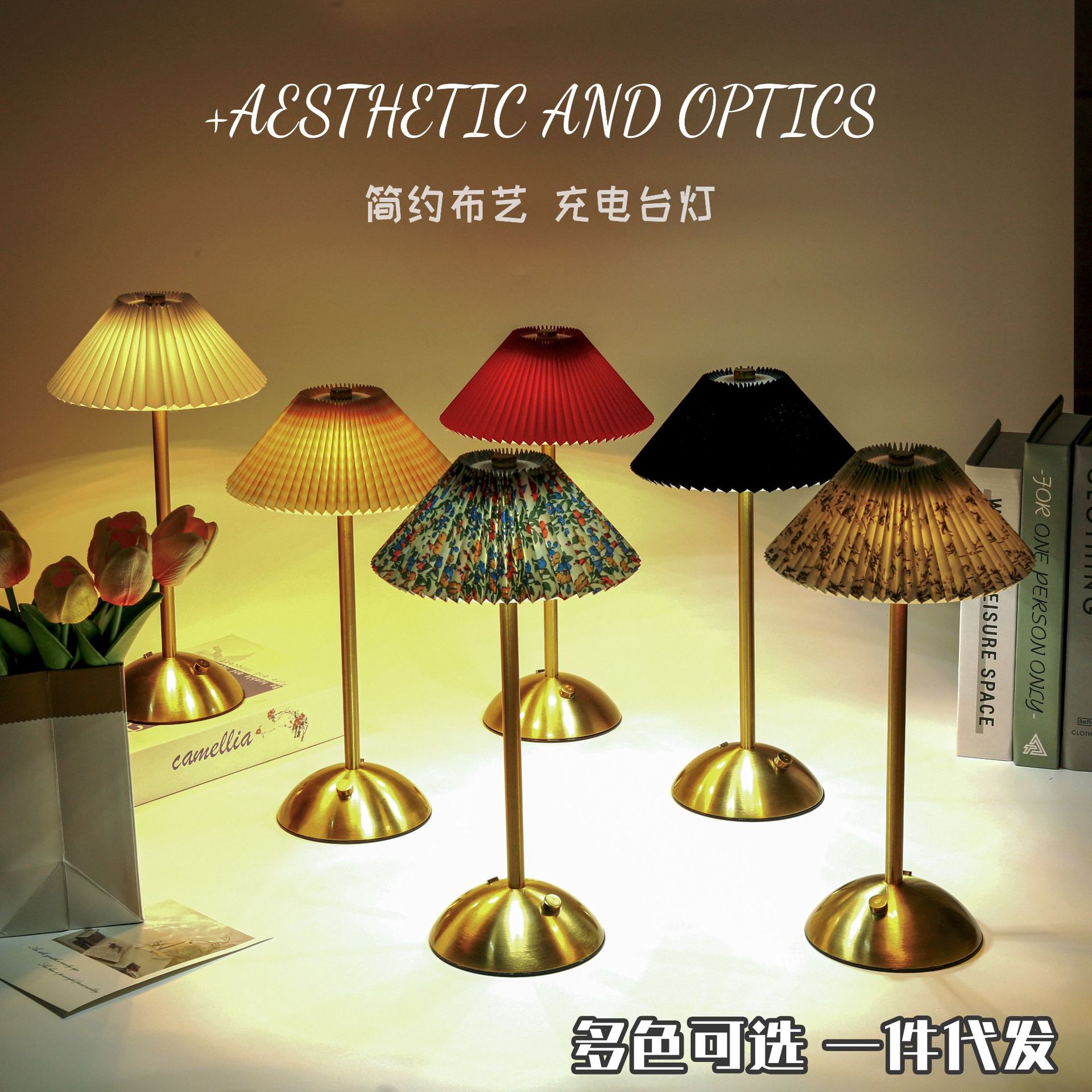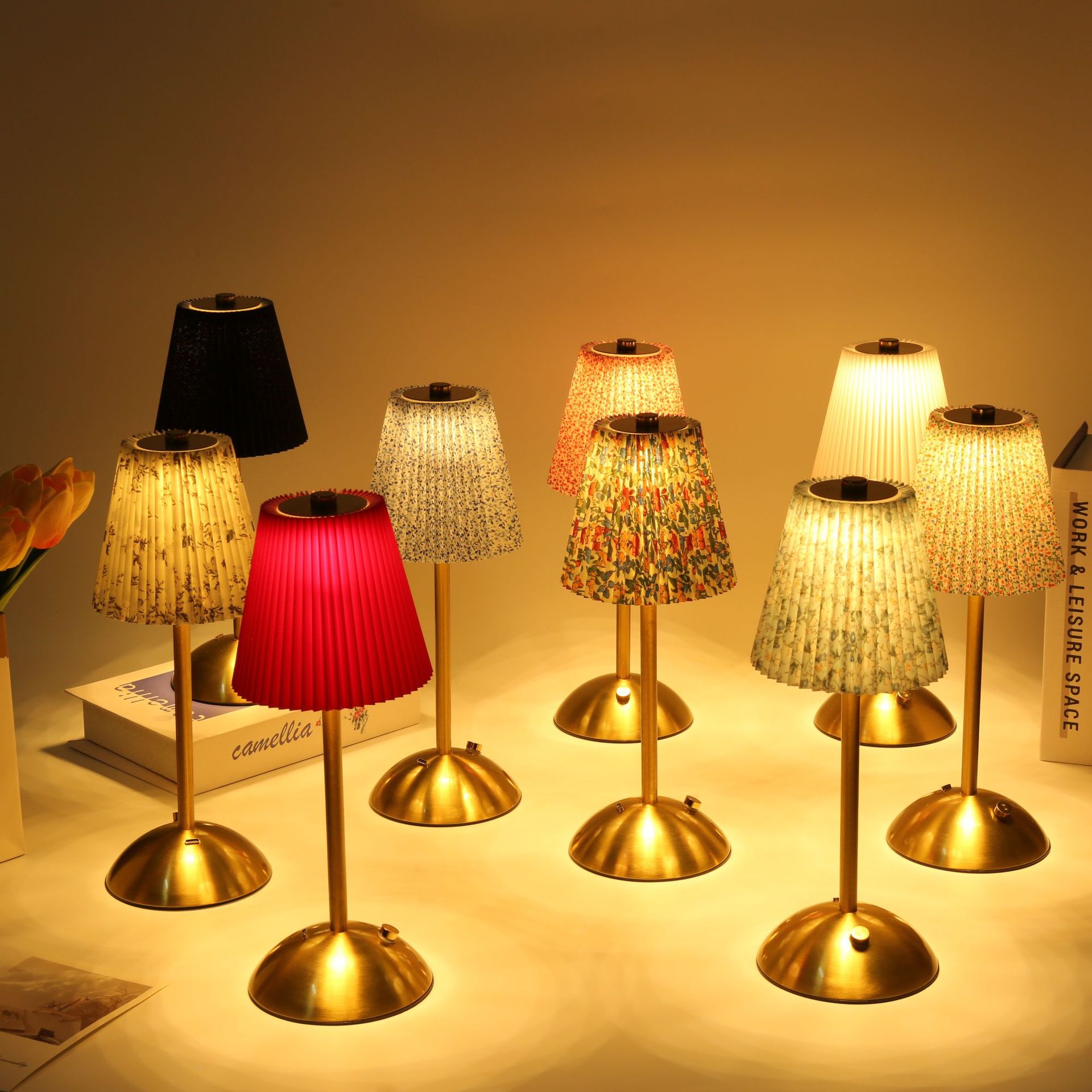 クロスボーダー布製プリーツメタル小型テーブルランプベッドサイドランプ3色調節可能タッチ式雰囲気照明調光可能北欧風