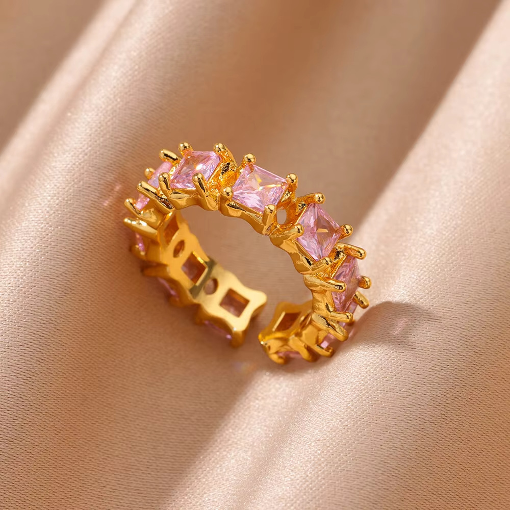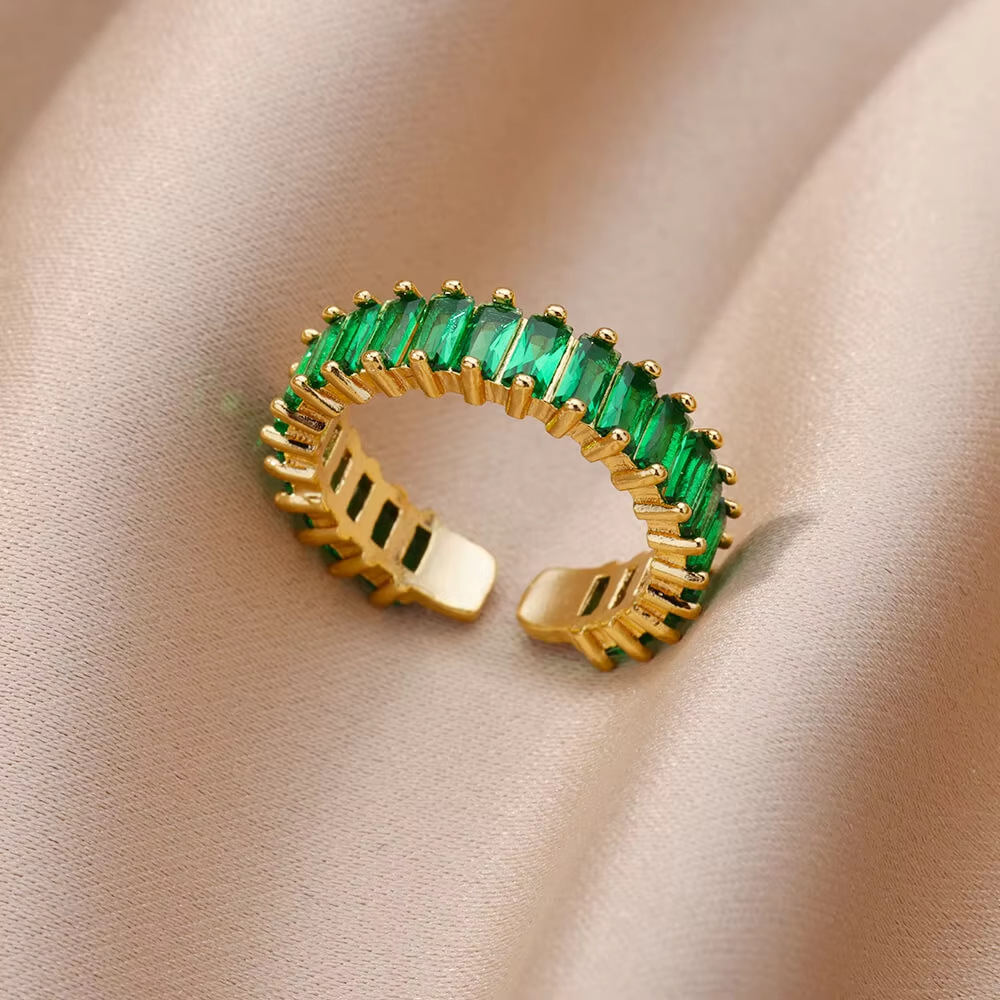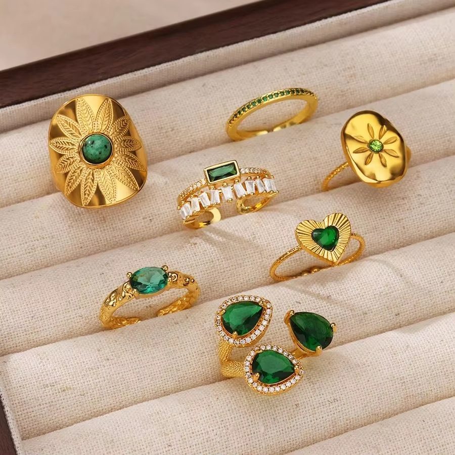 欧美跨境复古祖母绿天然石开口不锈钢戒指轻奢高级感锆石指环代发