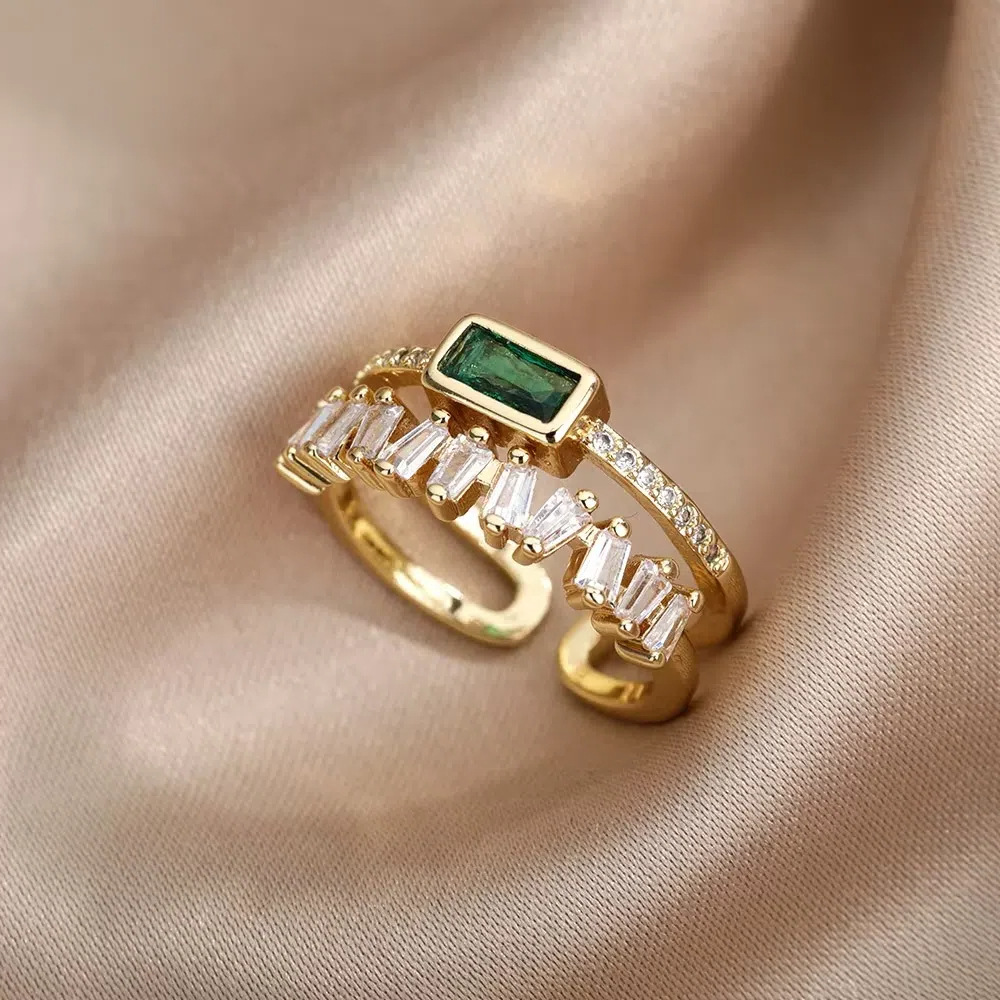 クロスボーダー軽豪華復古風グリーンジルコン開口指輪18k金メッキ祖母緑高級感指輪アクセサリー