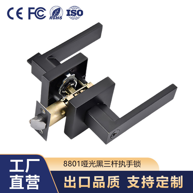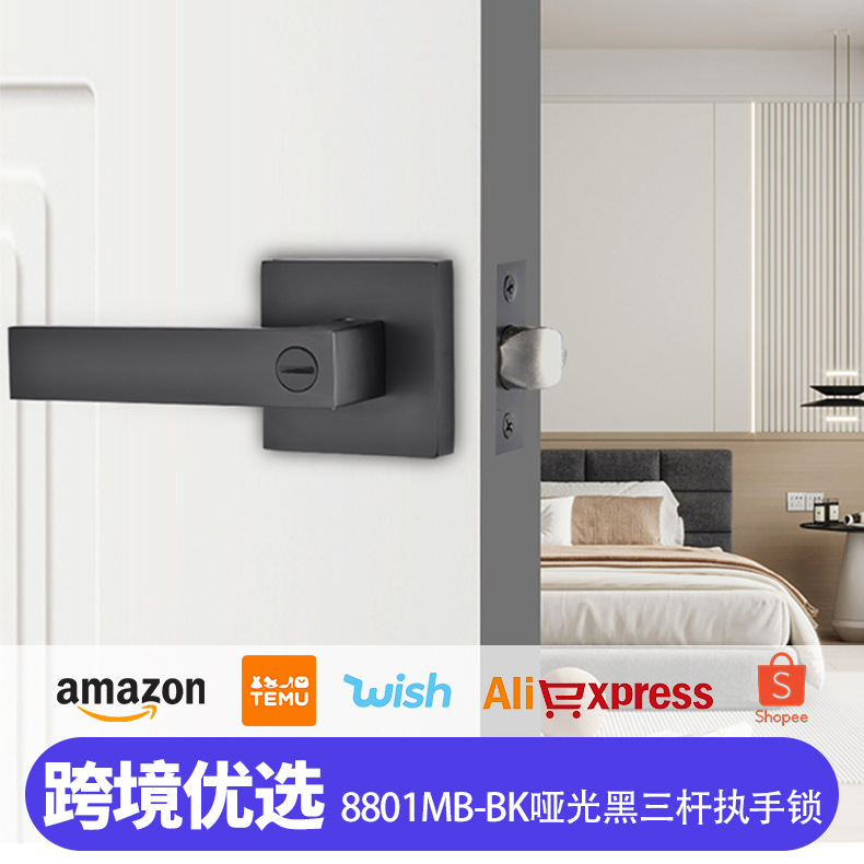 8801MB-BKアルミニウム合金入室ドアロックマット黒室内ドアロック三バーロック静音汎用型木製ドアロック