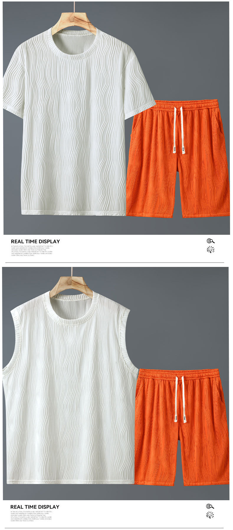 黒のTシャツと黒のショートパンツスーツ,白いTシャツと白いショートパンツスーツ,白いTシャツとオレンジのショートパンツスーツ,黒のベスト黒のショートパンツスーツ,白いベストと白いショーツスーツ,白いベストとオレンジ色のショートパンツスーツ