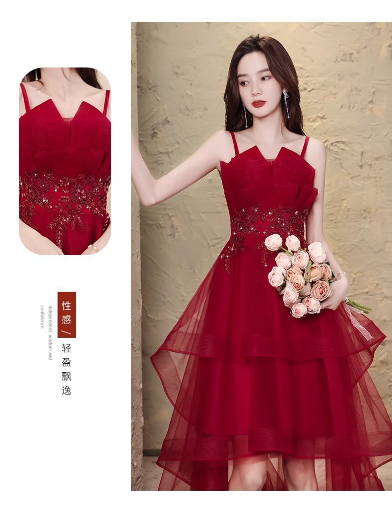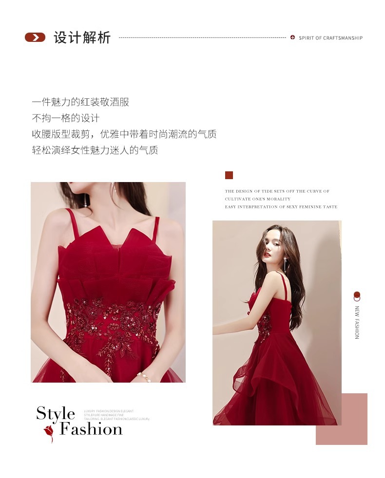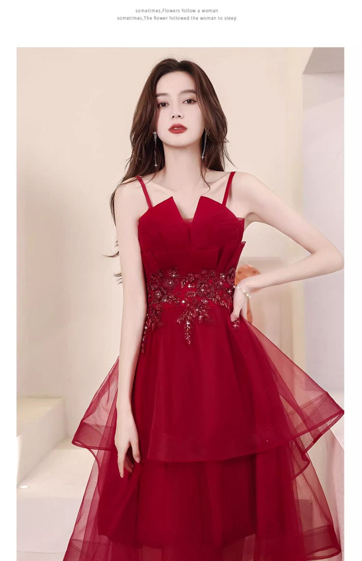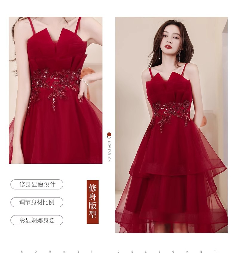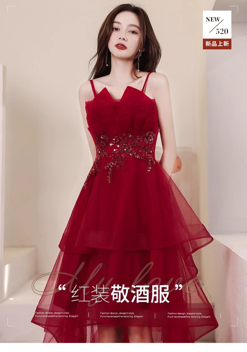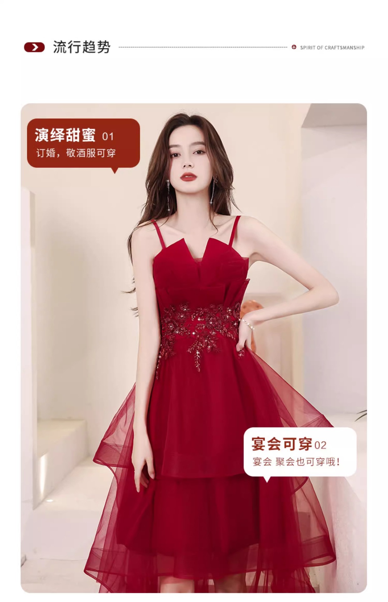 敬酒服の新婦2025の新型の赤いウェディングドレスの赫本風の赤いスカートの婚約のワンピースの結婚の小さい夜のドレスの女性
