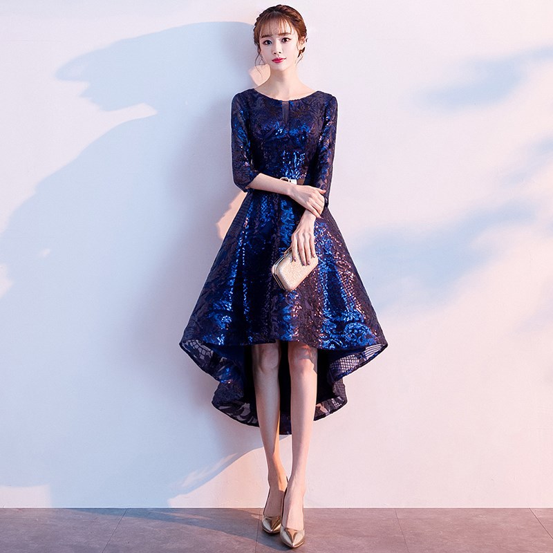 抖音蓝色晚礼服女高级感气质高端轻奢小众小个子年会主持人连衣裙