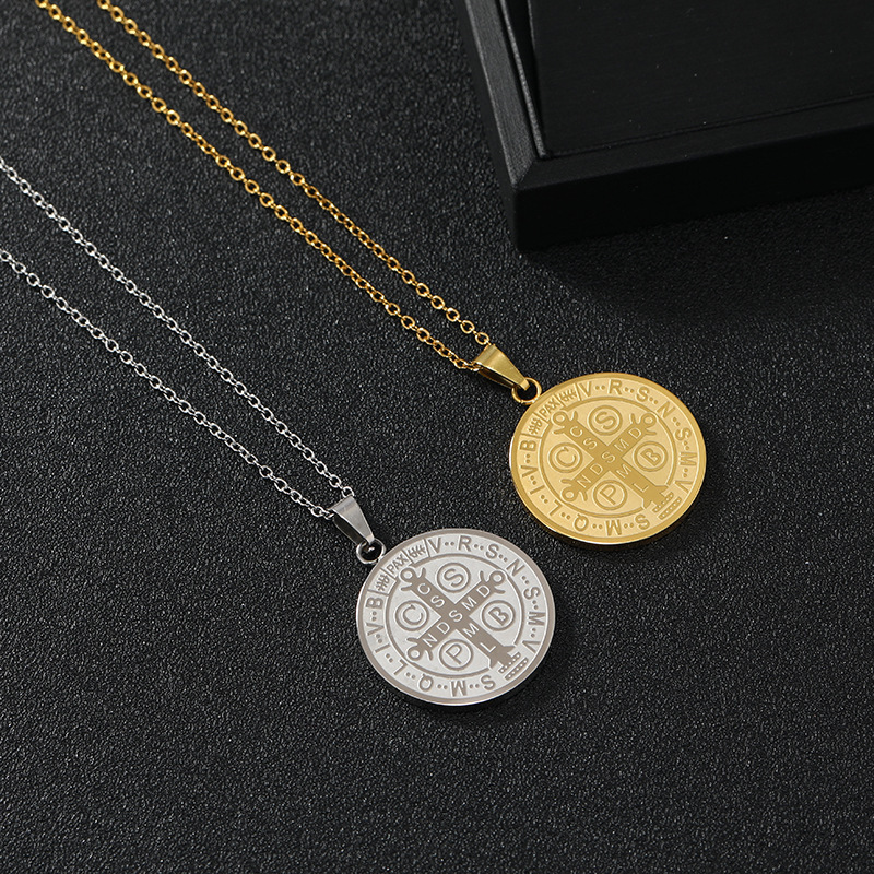 ヨーロッパとアメリカのクロスボーダー神父聖ベネディクトネックレスエクソシストステンレス鋼ペンダント男性と女性のレトロなラウンドジュエリー卸売