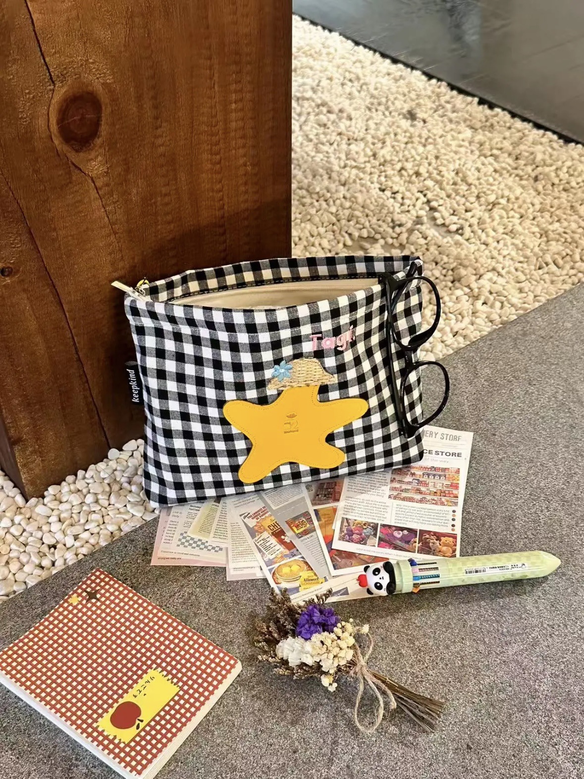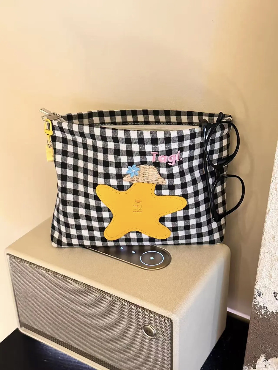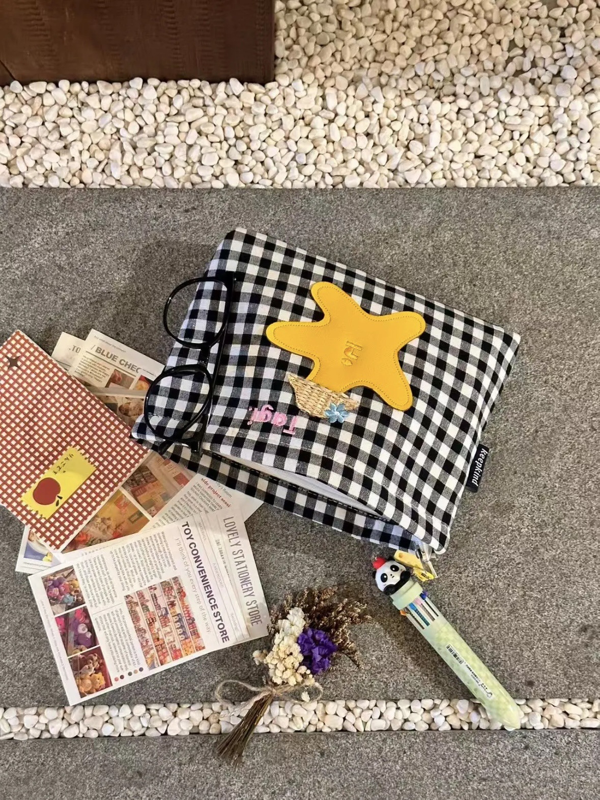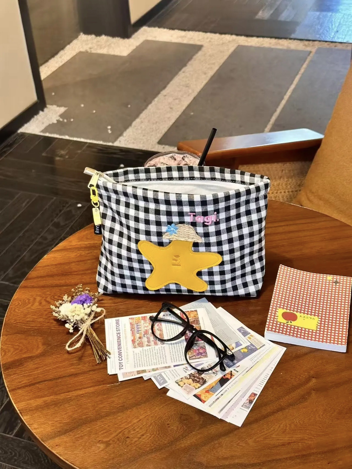 白黒チェック柄刺繍クラッチバッグ