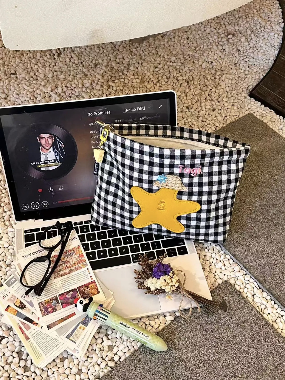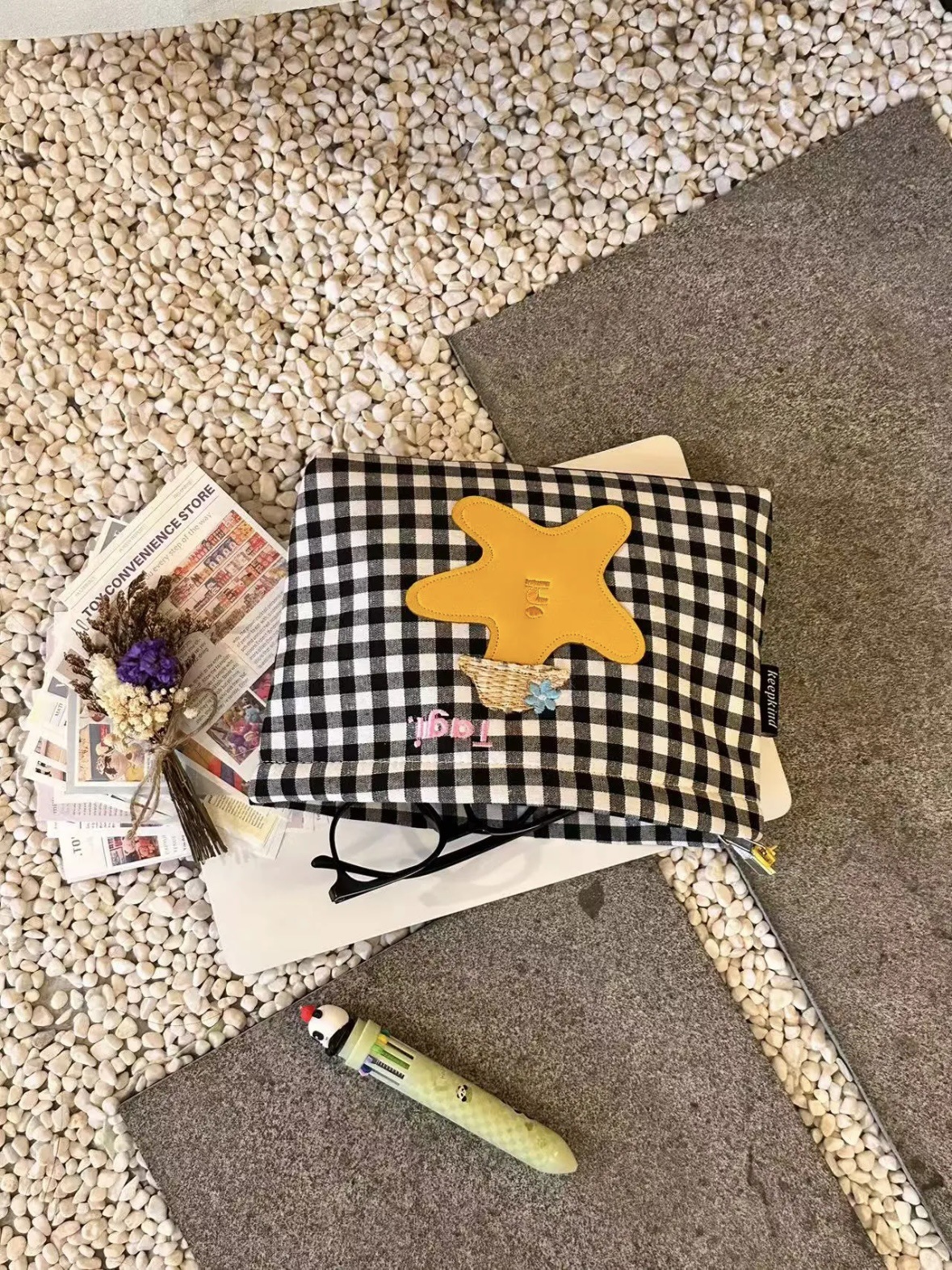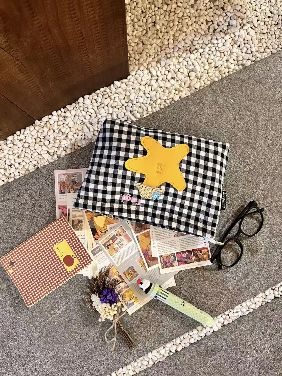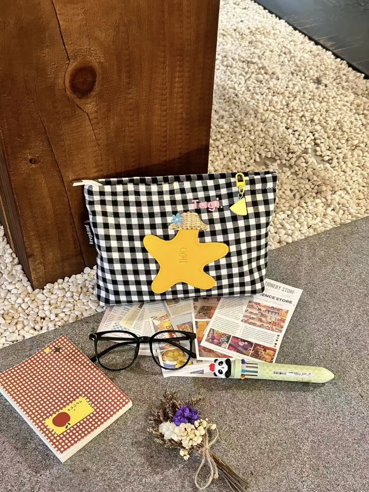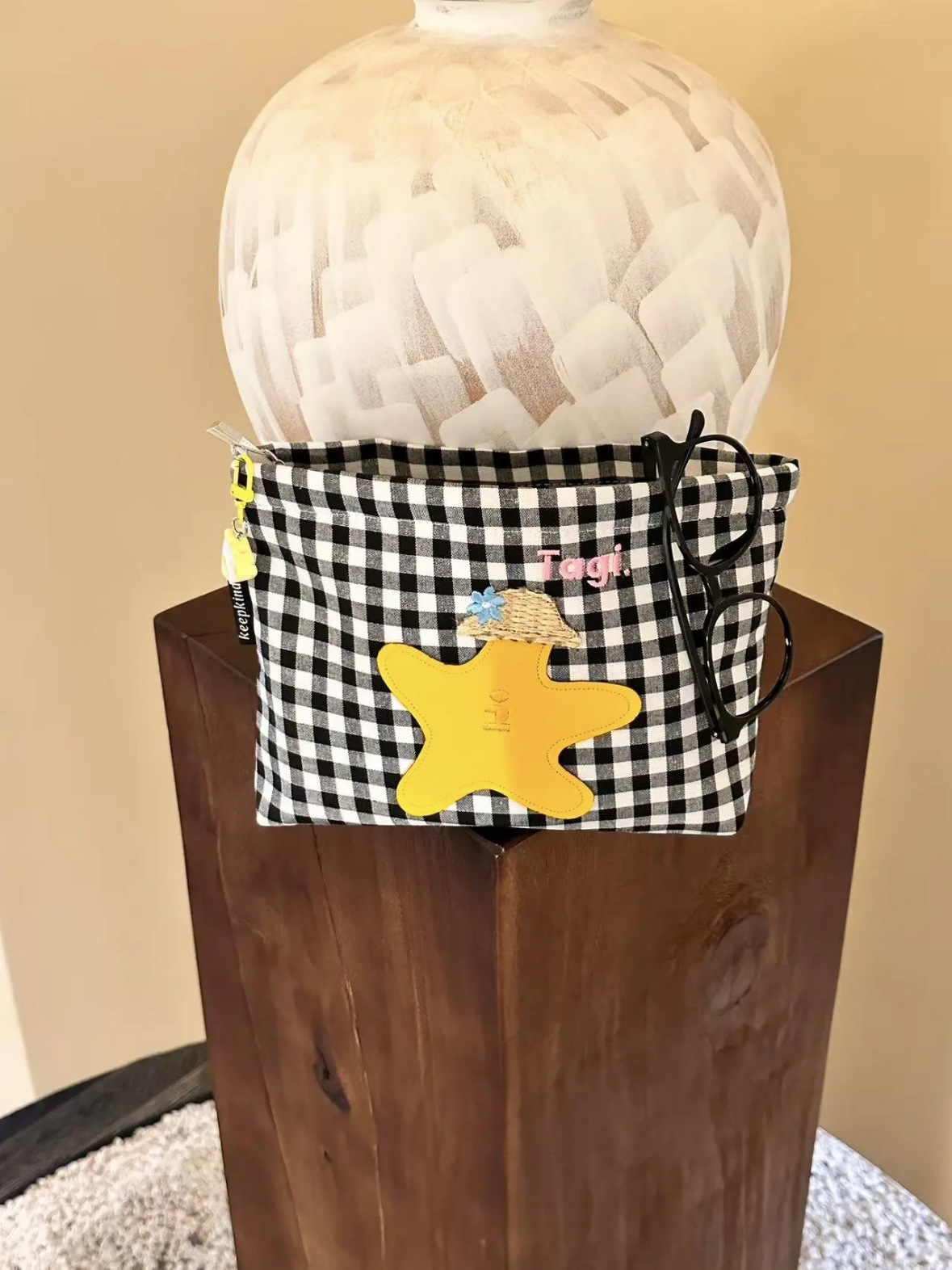 白黒チェック柄刺繍クラッチバッグ