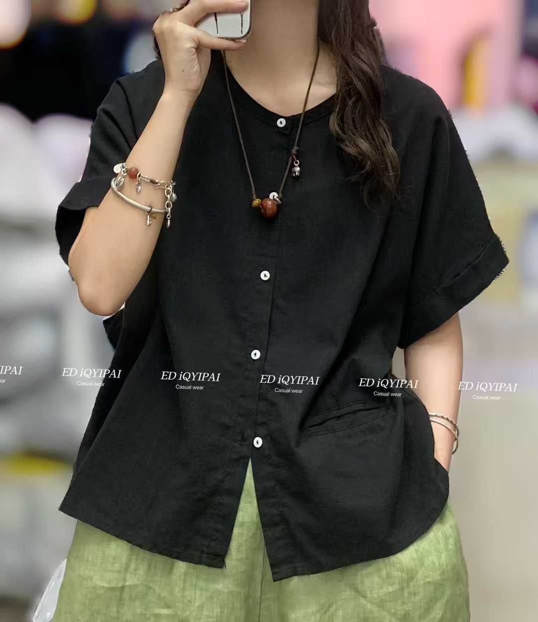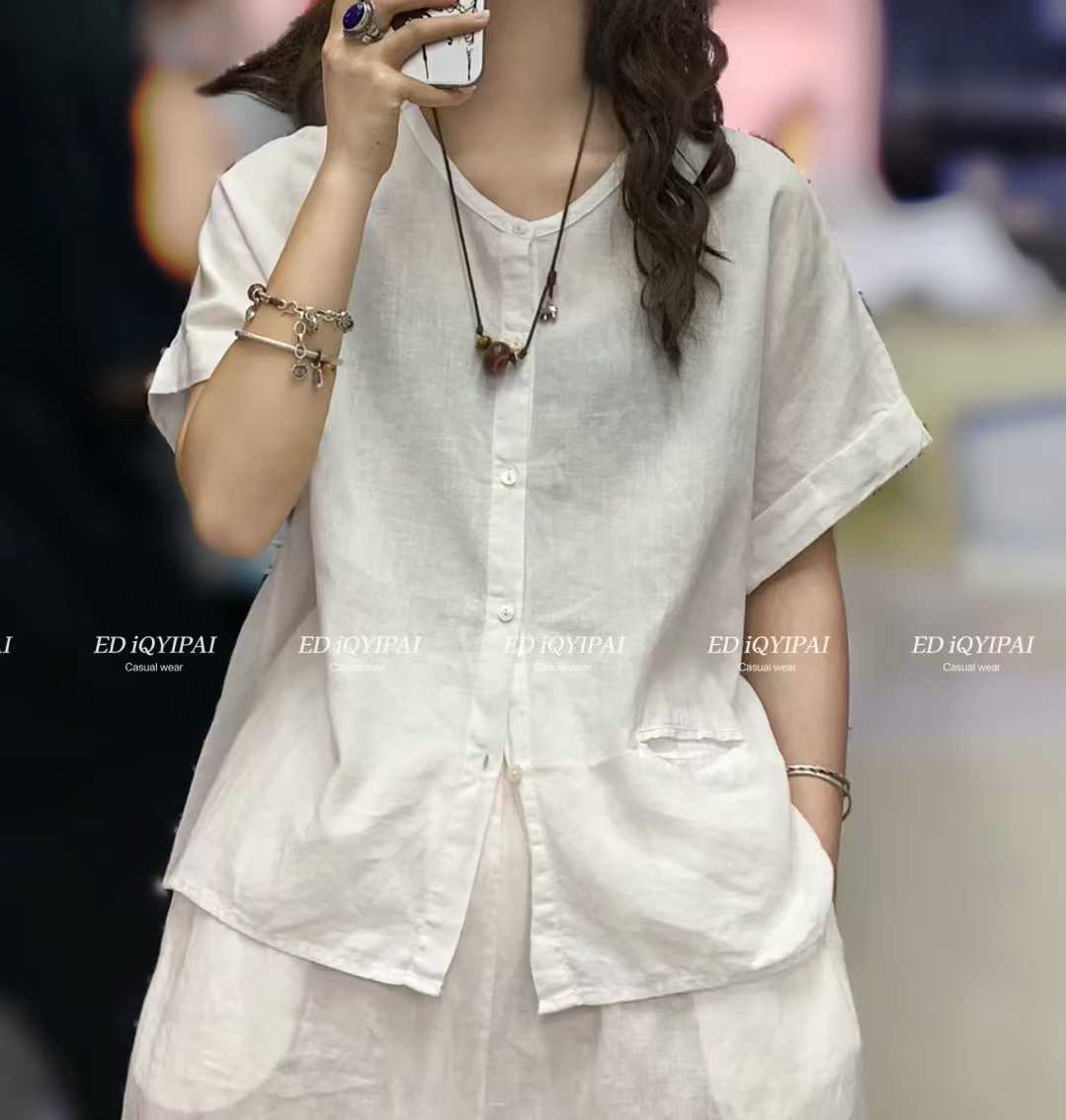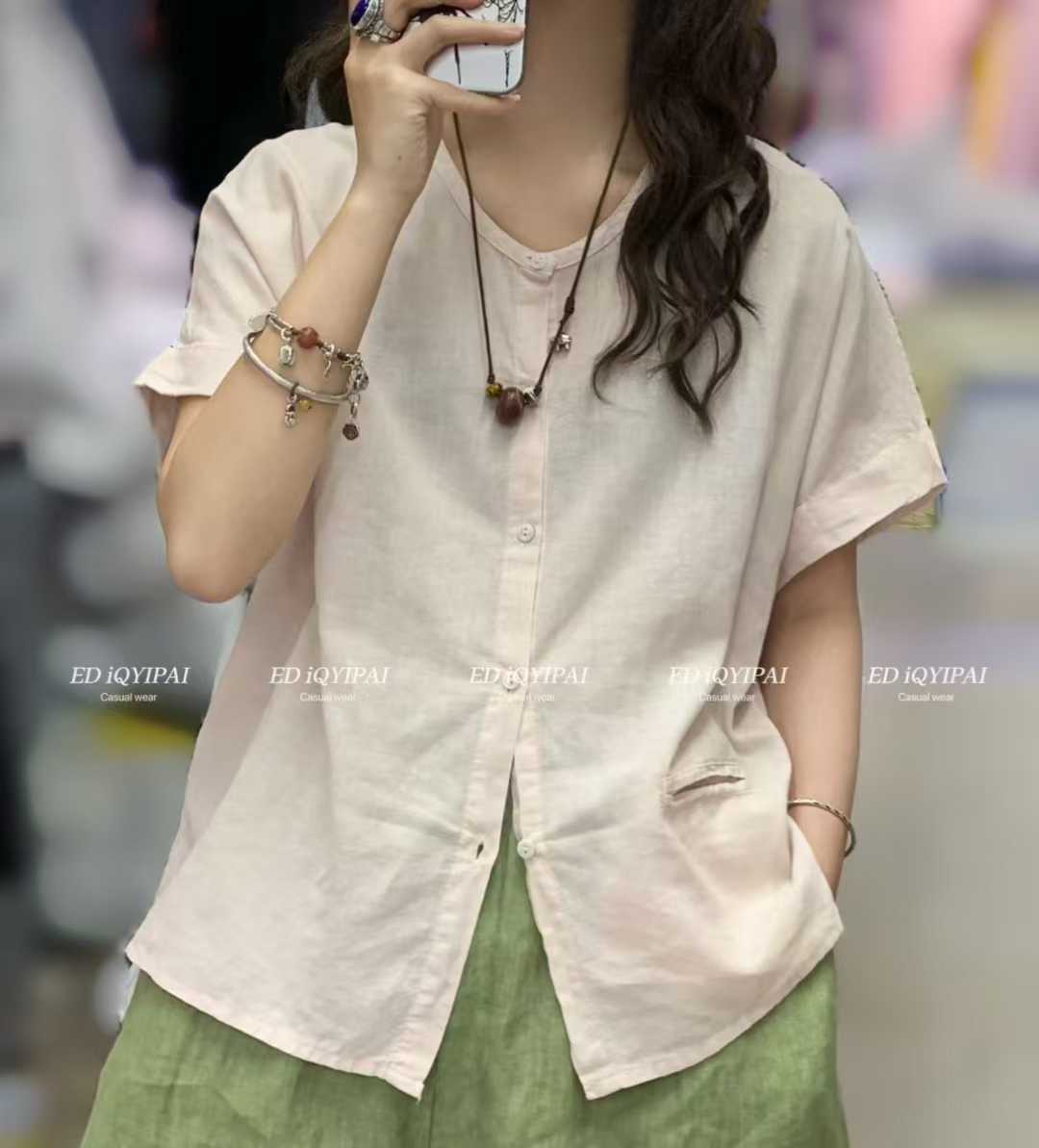 Ed906綿麻丸襟ゆるい純色シンプルなカーディガンtシャツ女性2025夏カジュアルシャツ夏服