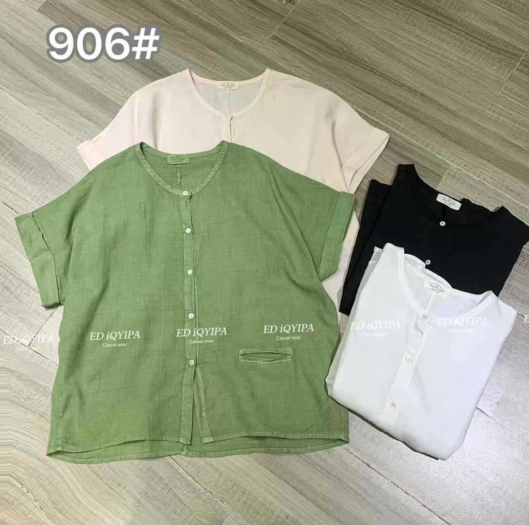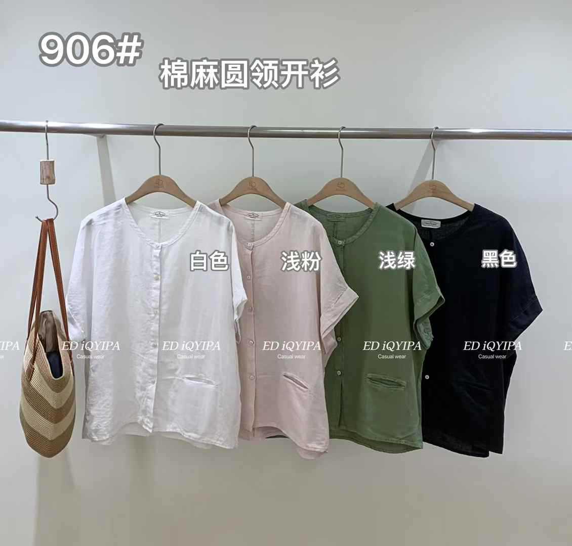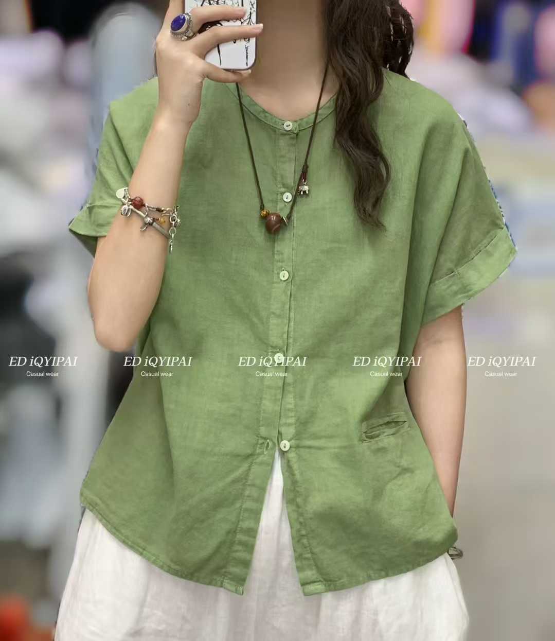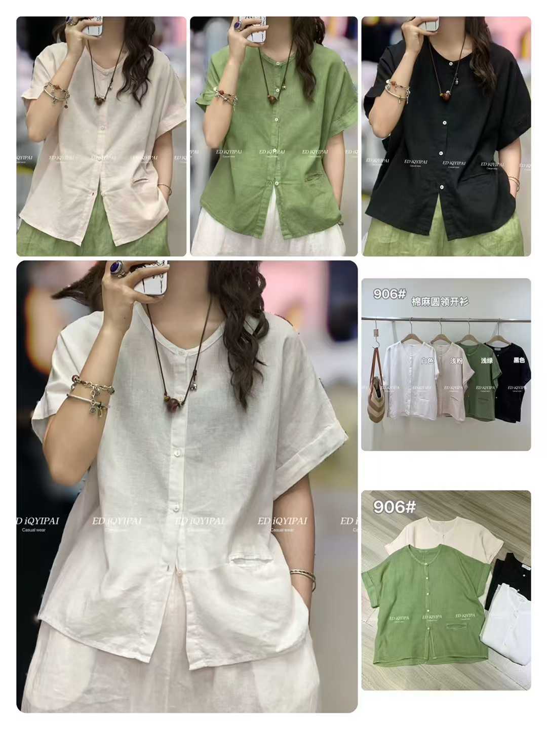 Ed906綿麻丸襟ゆるい純色シンプルなカーディガンtシャツ女性2025夏カジュアルシャツ夏服
