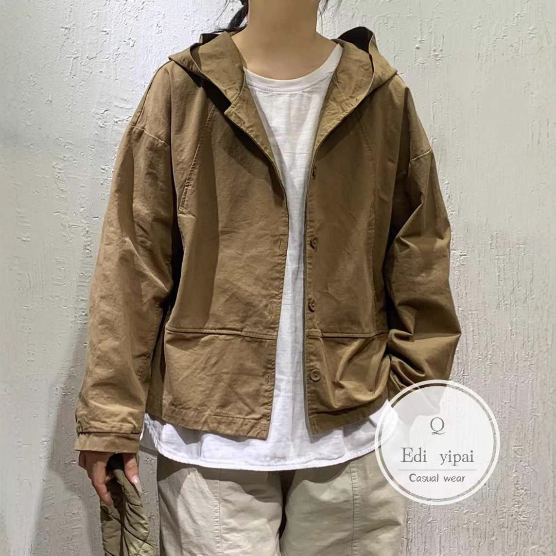 ed007358韩版洗水棉帽款外套新款纯色休闲百搭拼接气质开衫外套女
