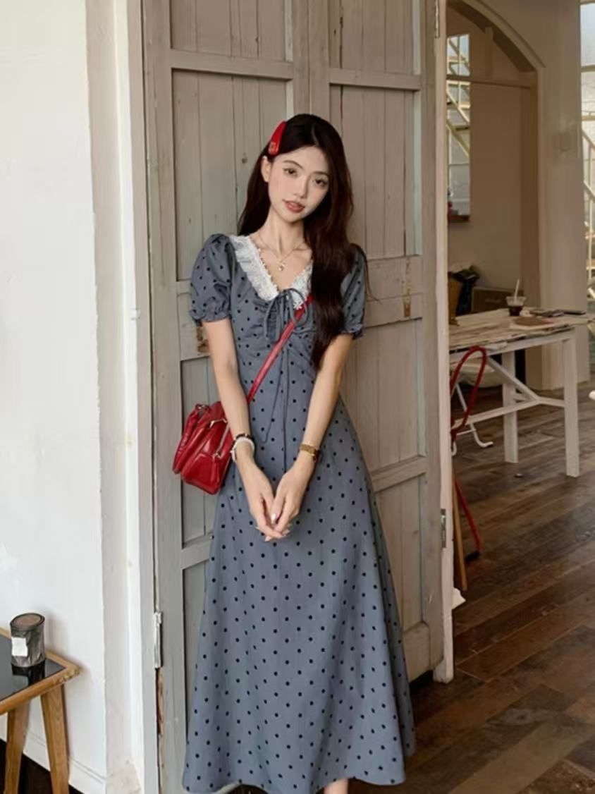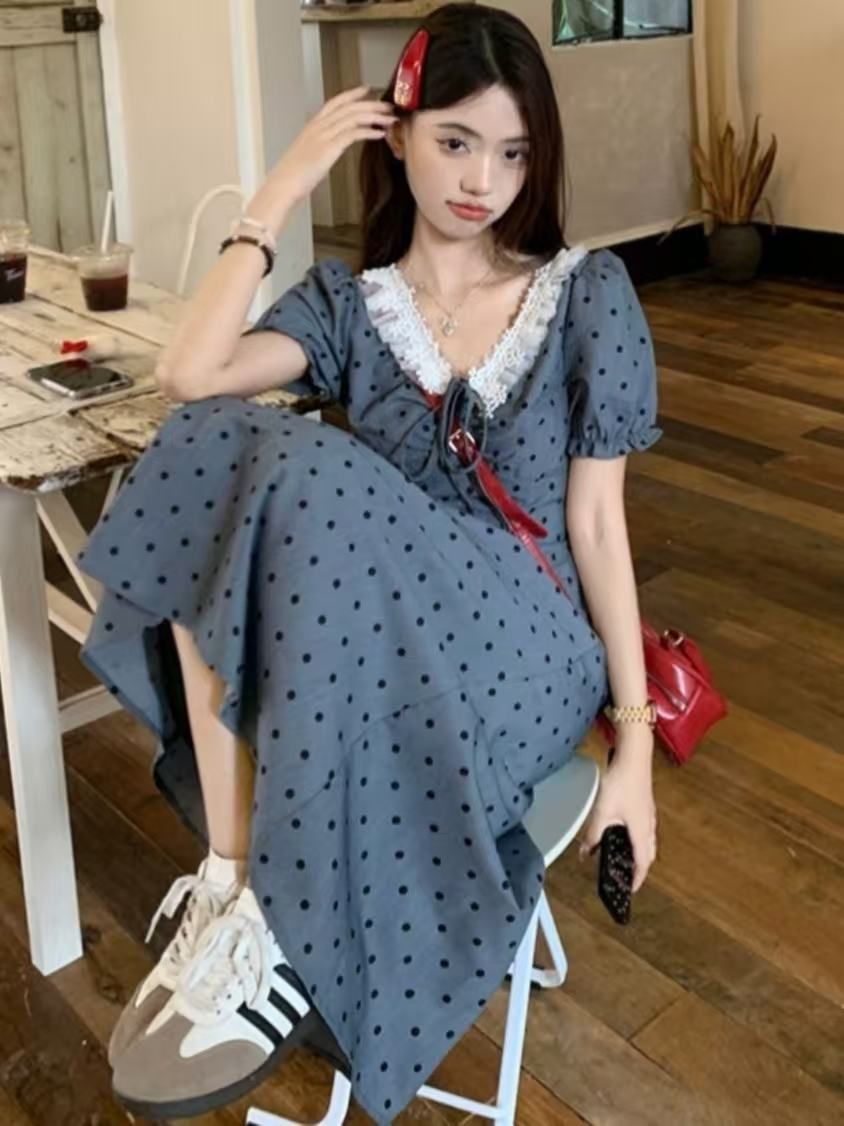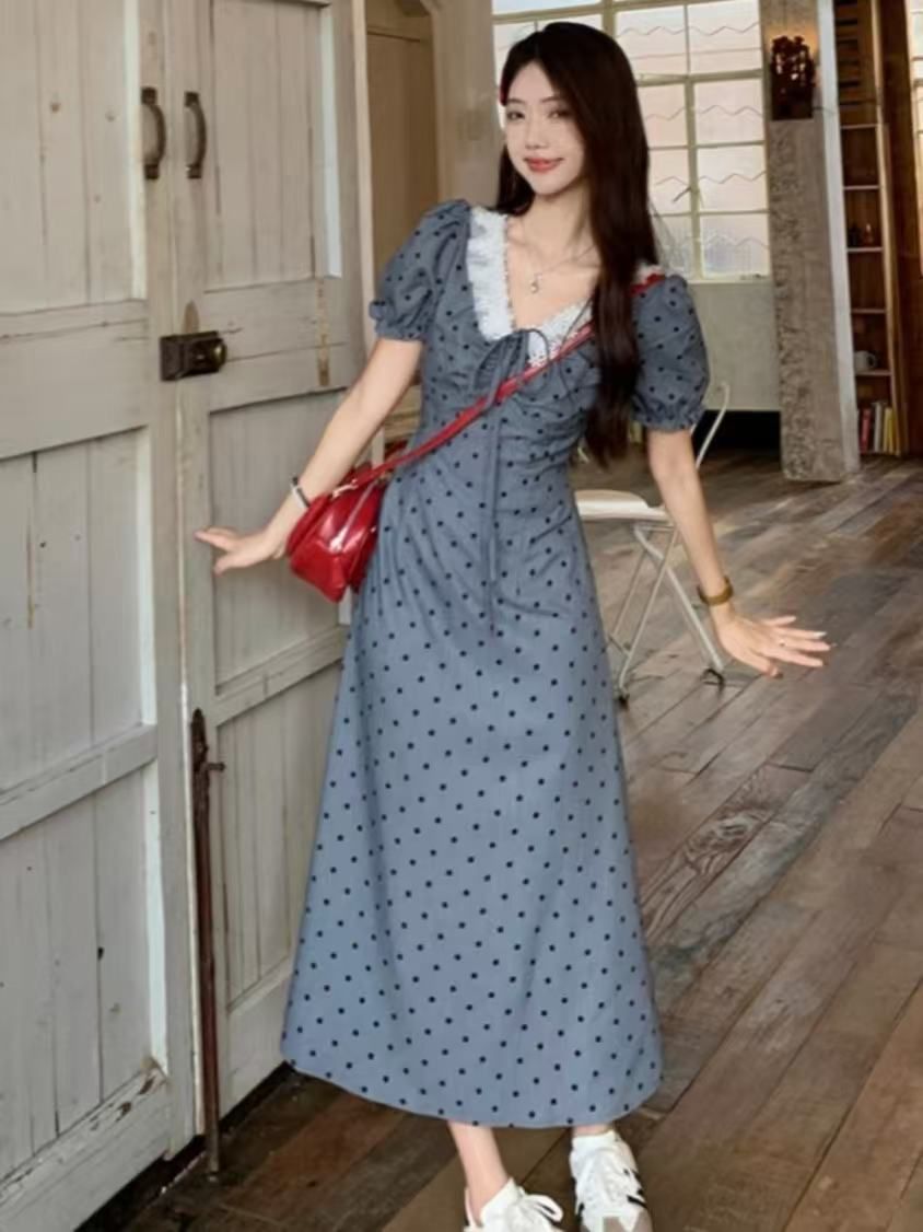 フレンチガーリーレースカラーグレードレスレディース夏洋ナシ型ウエスト痩身水玉模様ロングスカート