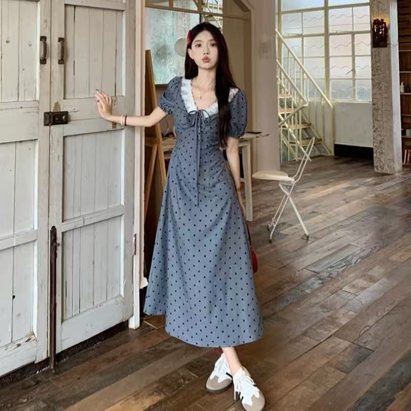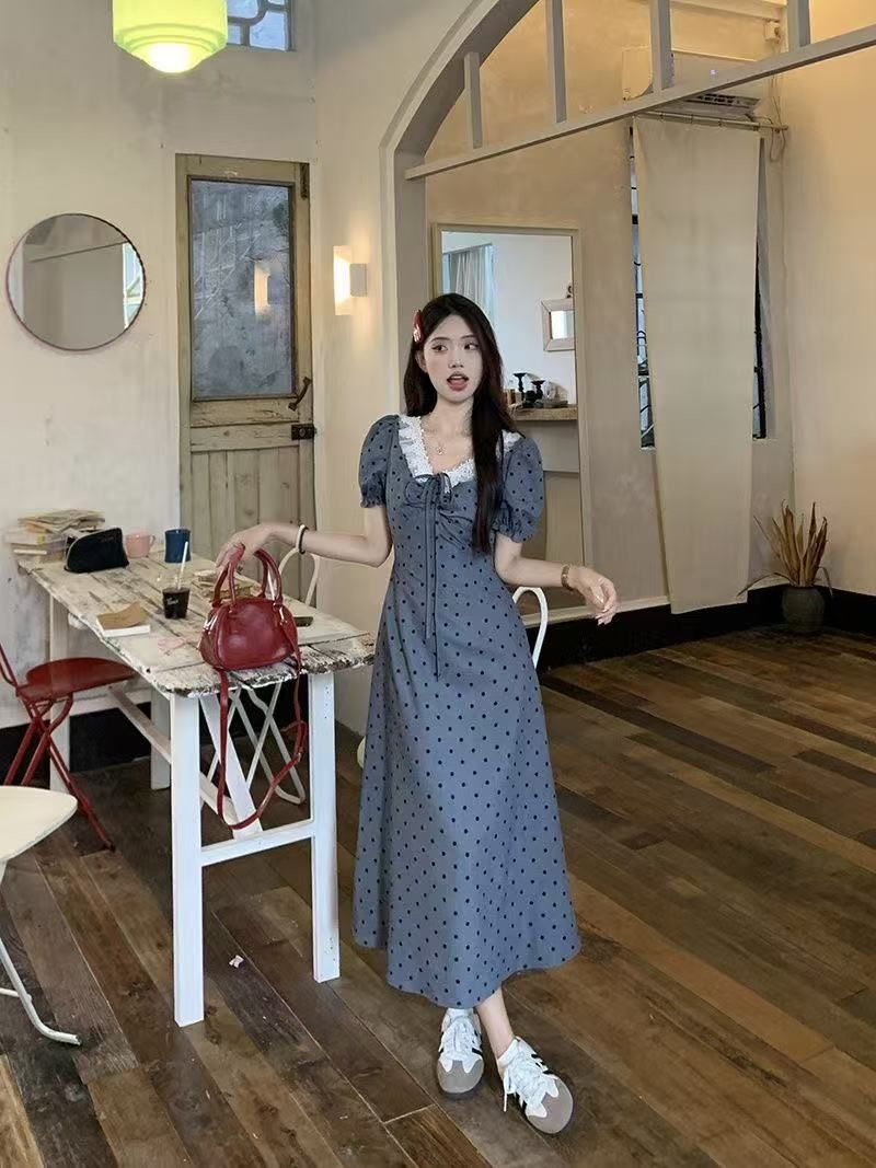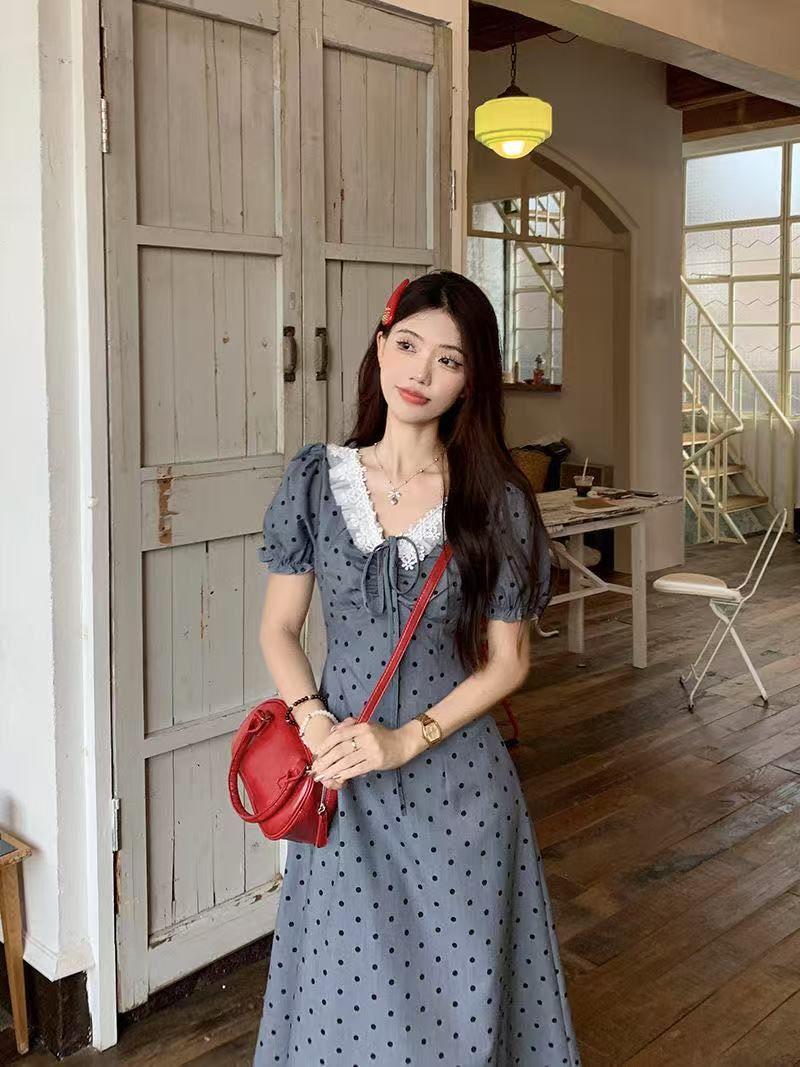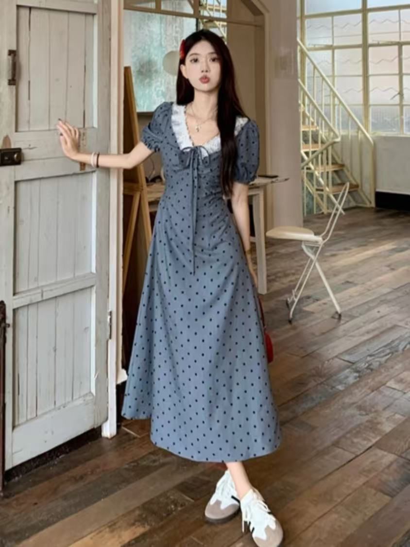 フレンチガーリーレースカラーグレードレスレディース夏洋ナシ型ウエスト痩身水玉模様ロングスカート