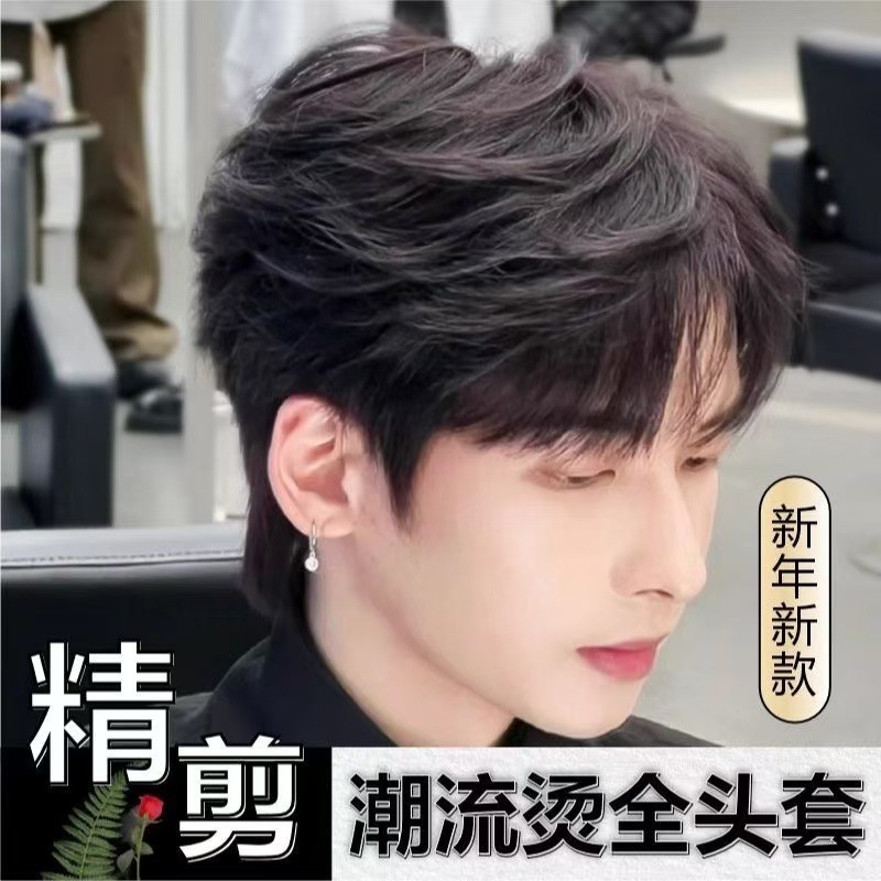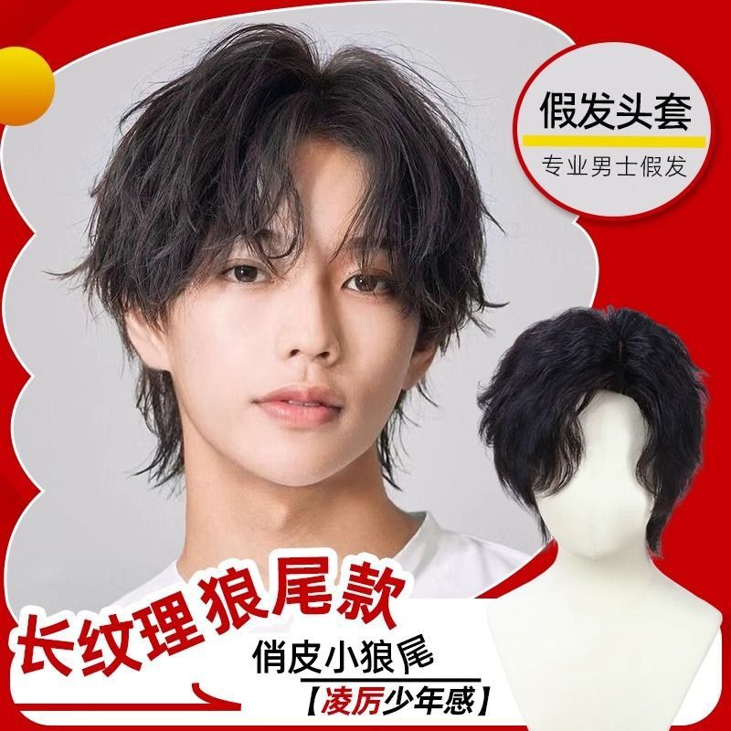 男士假发真发全头套式狼尾鲻鱼头假发男卷发自然蓬松帅气头顶补发