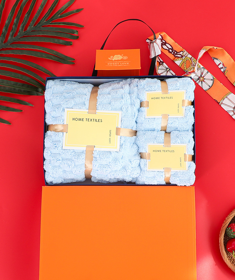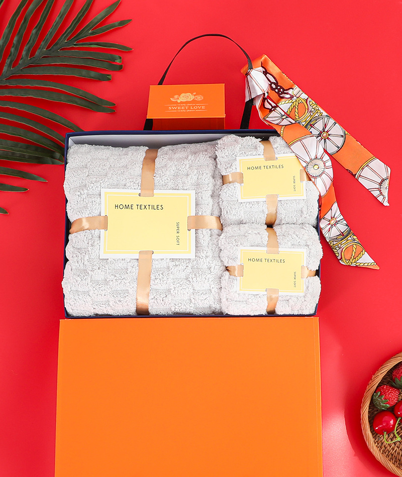 サンゴの毛のタオルのバスタオルのギフトボックスの3つのセットの純綿のタオルの包装のセットの刺繍の結婚のお土産のギフトボックス