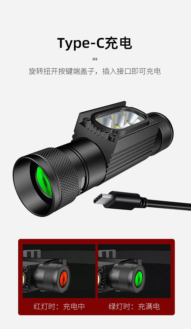 国境を越えた新型LEDヘッドライトType-C充電屋外で走ることは、赤い警告の強いヘッドライトを取り外すことができる