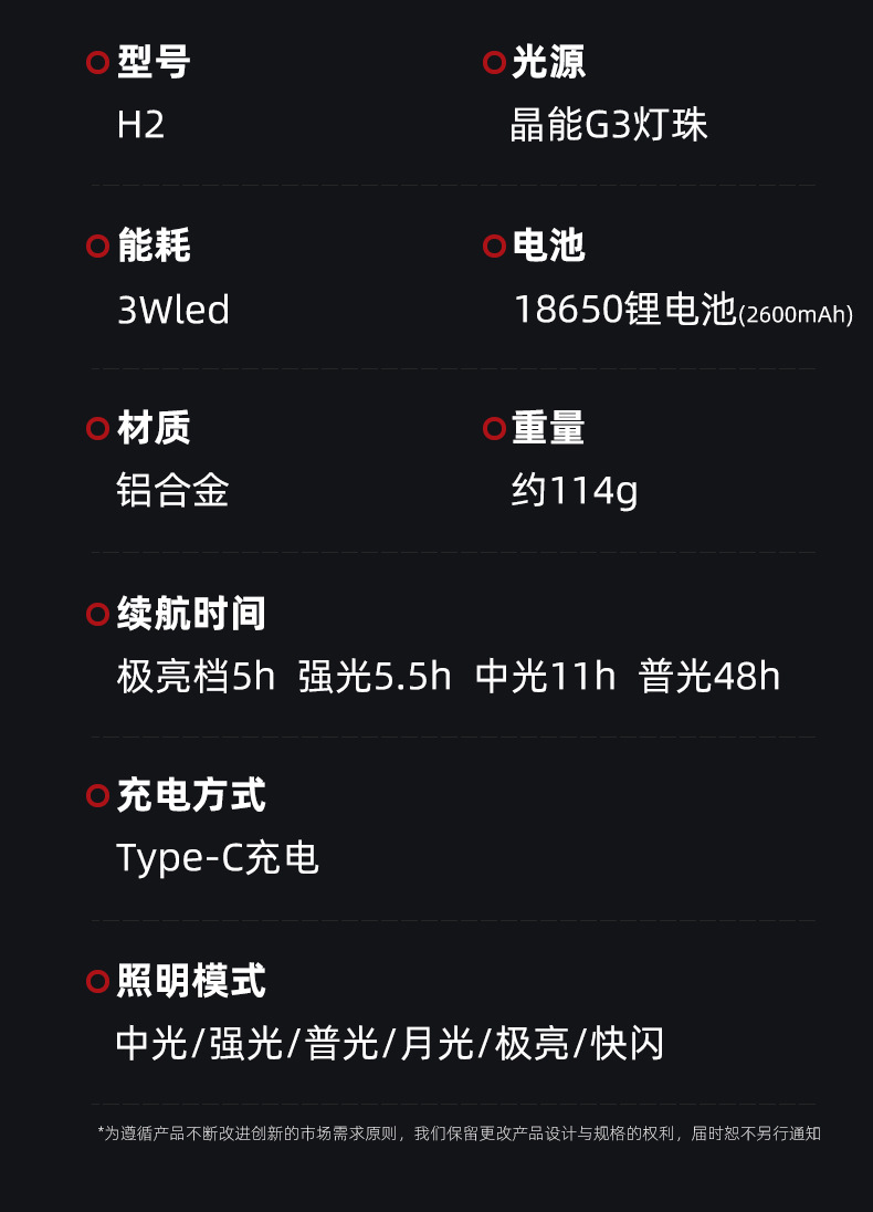 H2 (白色光): デュアル光源 - Type-C 充電 - 2600 リチウム電池,H2(白色光)+予備バッテリー1個