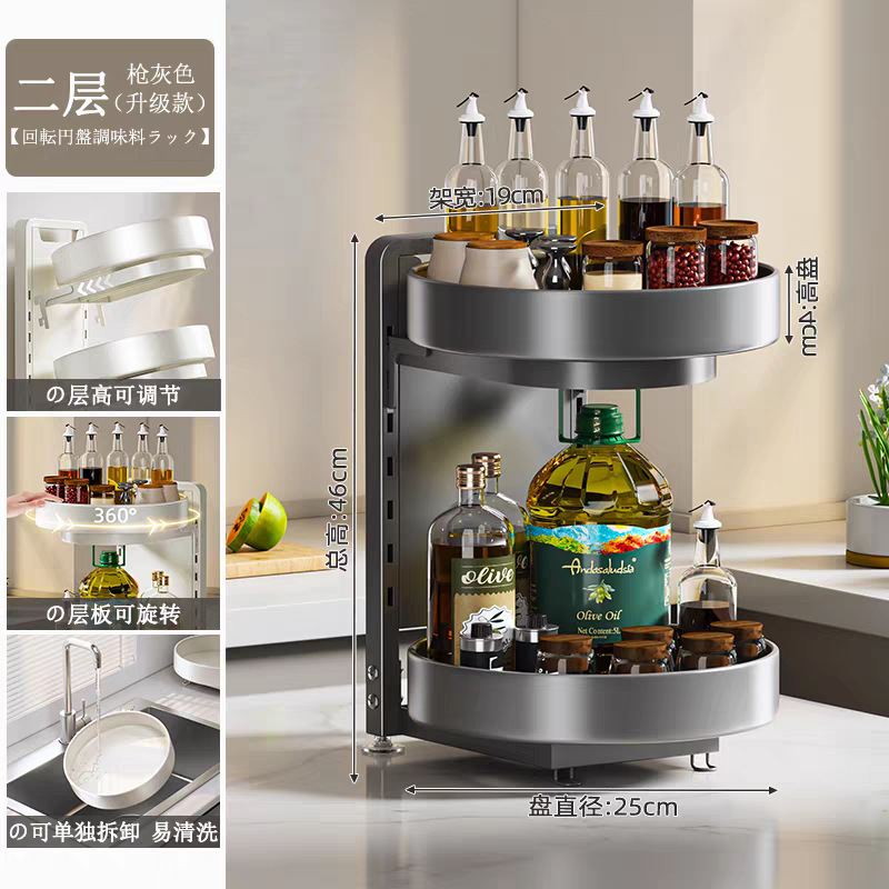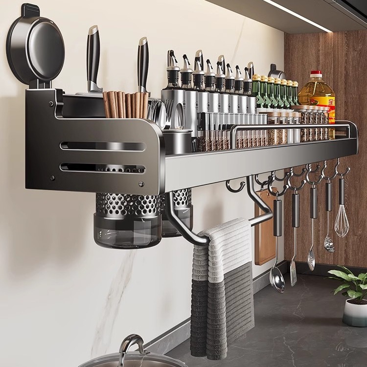 ガンメタルグレーのキッチン収納ラック、穴あけ不要の壁掛け調味料ラック、壁掛け式調味料収納ラック