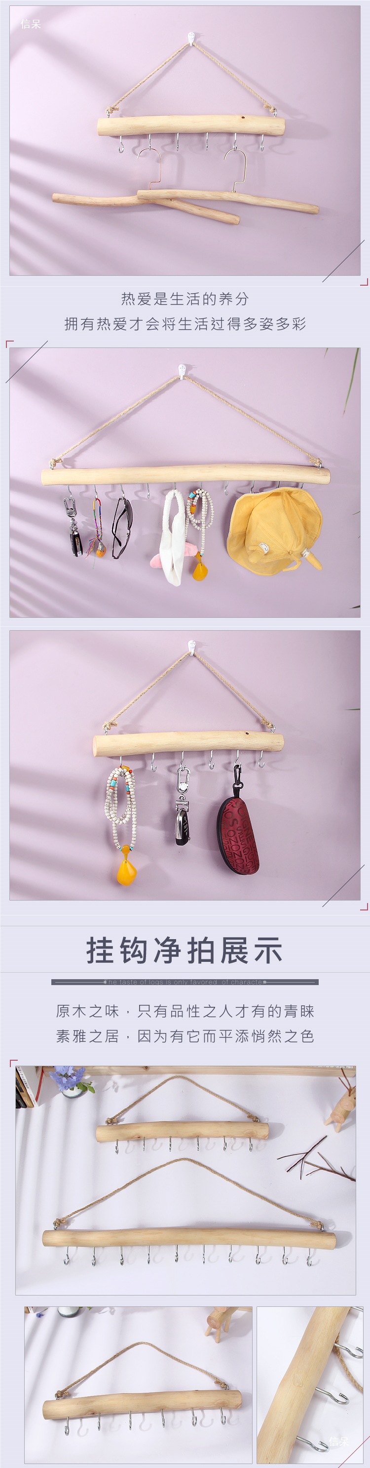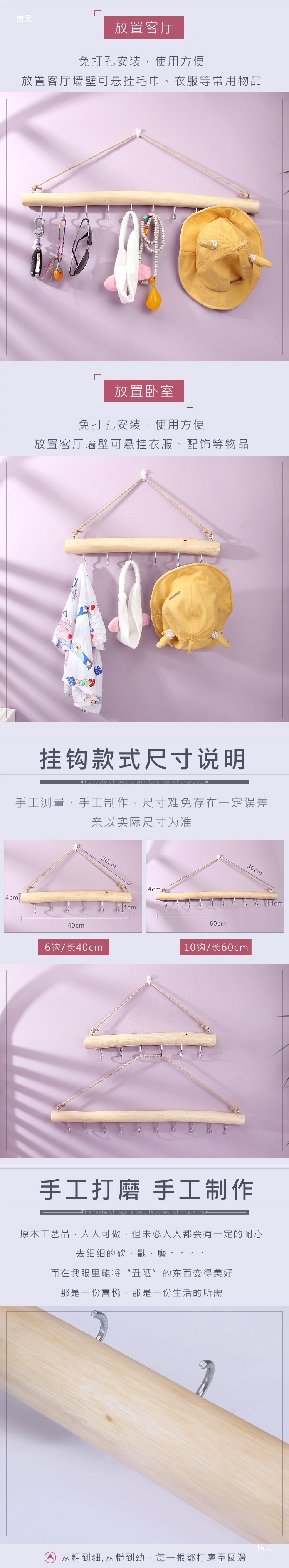 ドアの後ろに穴を開けずに服を掛けるためのクリエイティブな無垢材のフック、長い列の洋服掛け、バッグラック、釘なし
