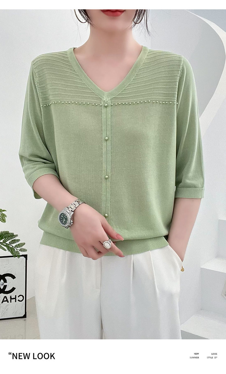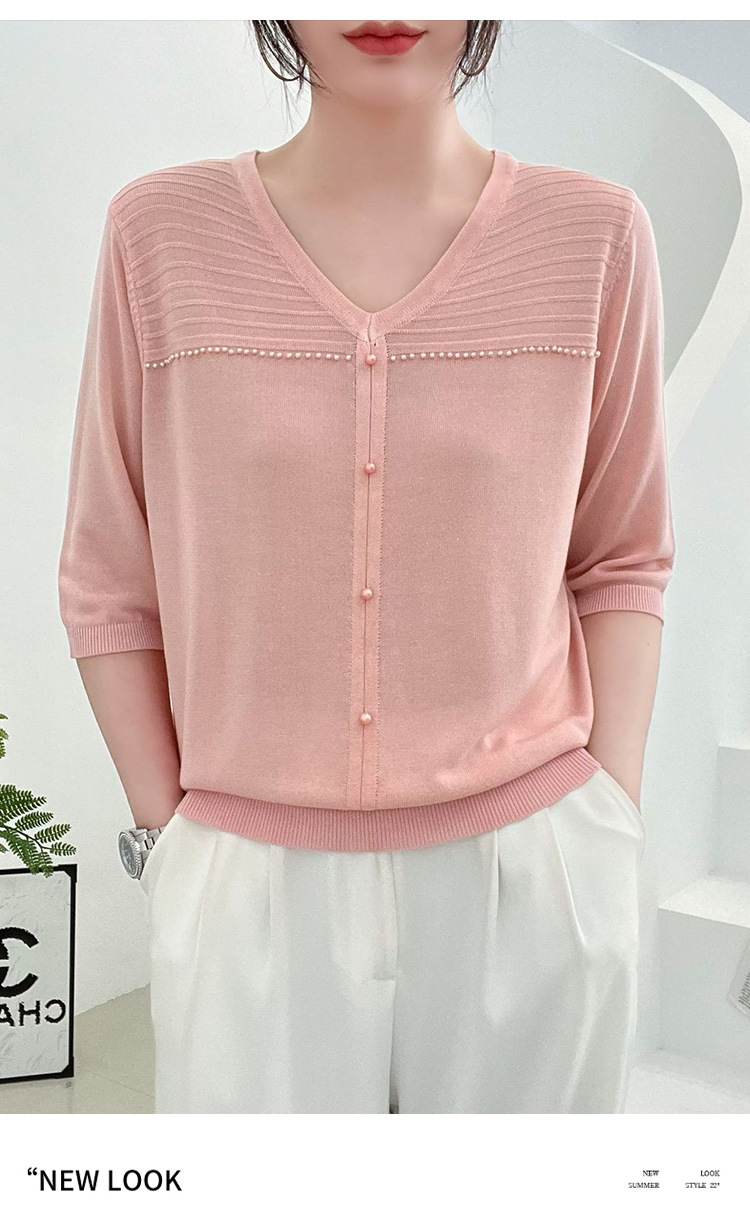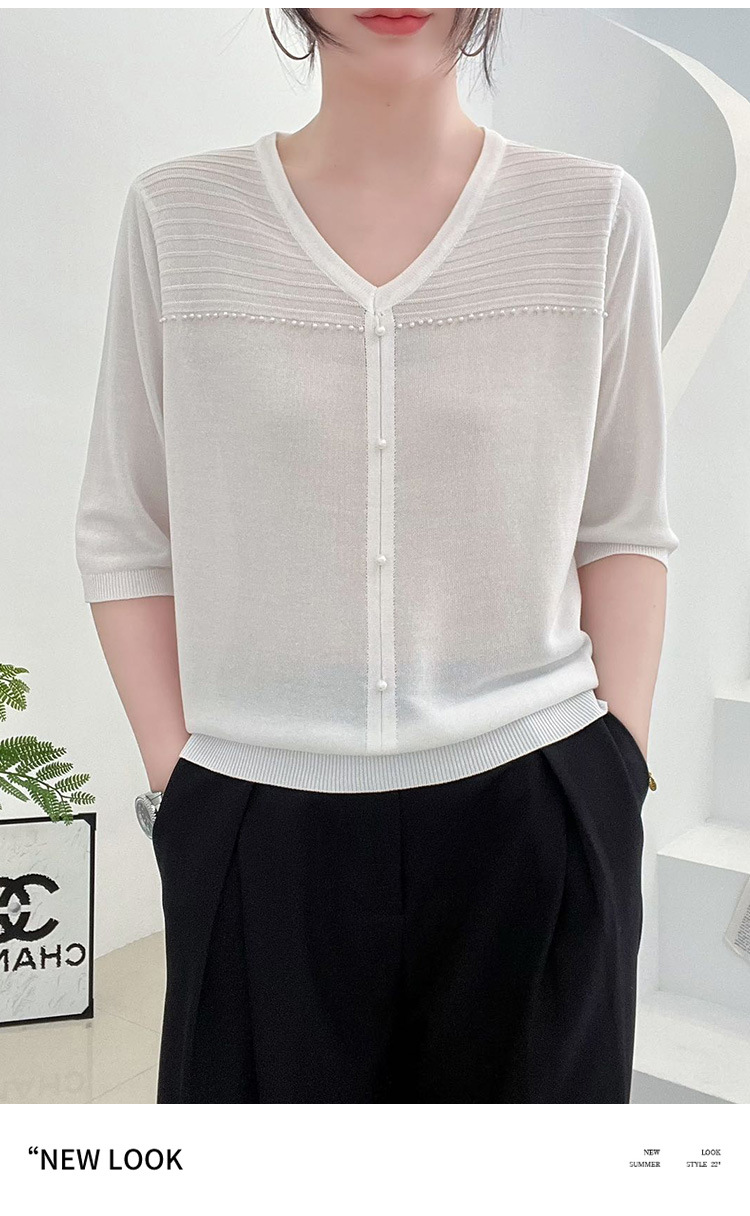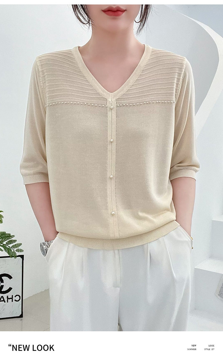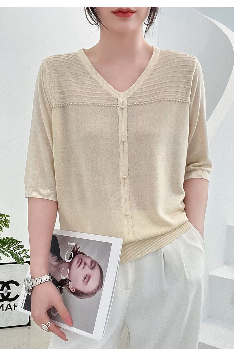 2025 新しい夏のテンセルリヨセル V ネックセーター半袖 Tシャツ女性の無地ビーズルーズボトムシャツ