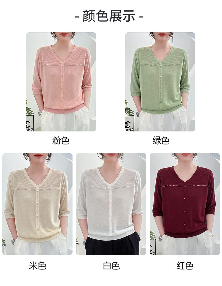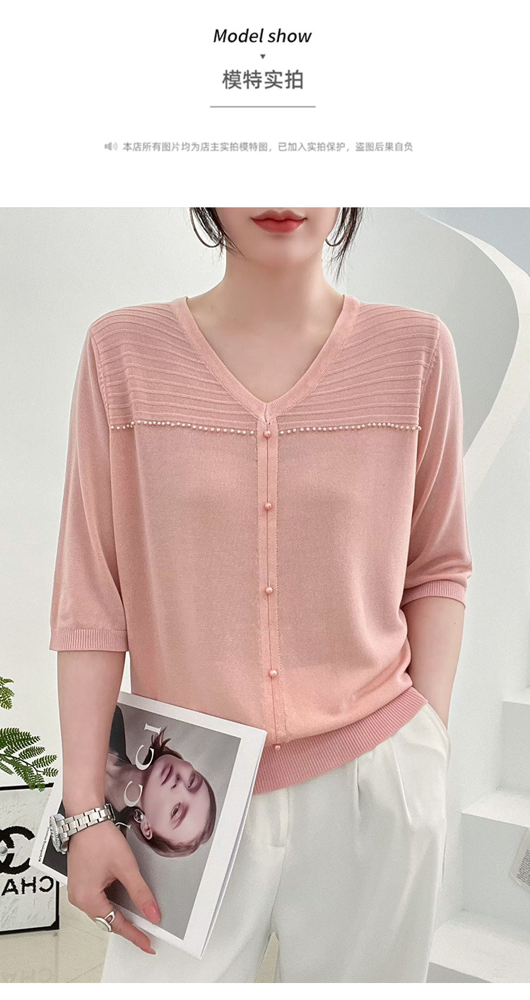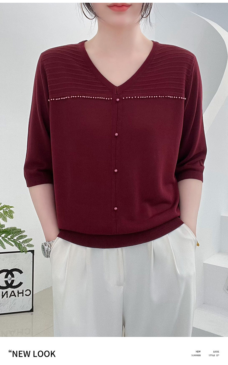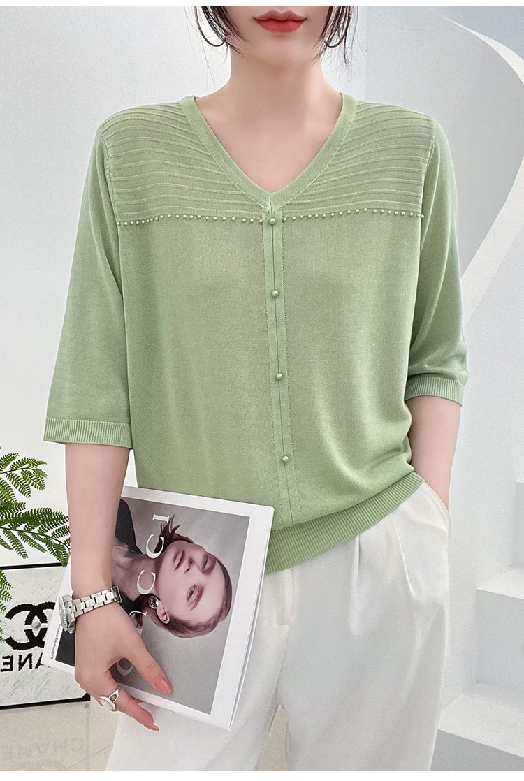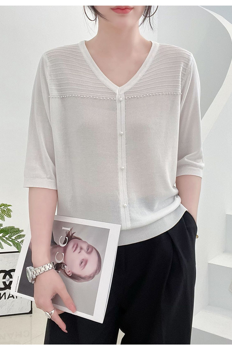 2025 新しい夏のテンセルリヨセル V ネックセーター半袖 Tシャツ女性の無地ビーズルーズボトムシャツ