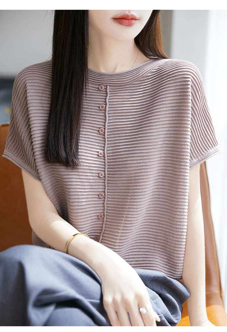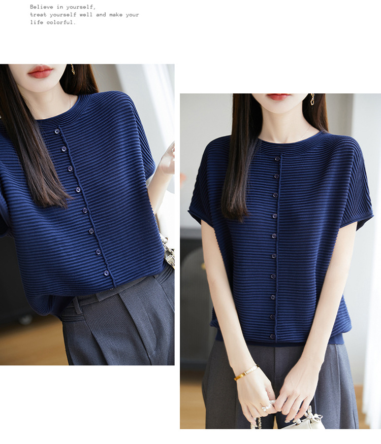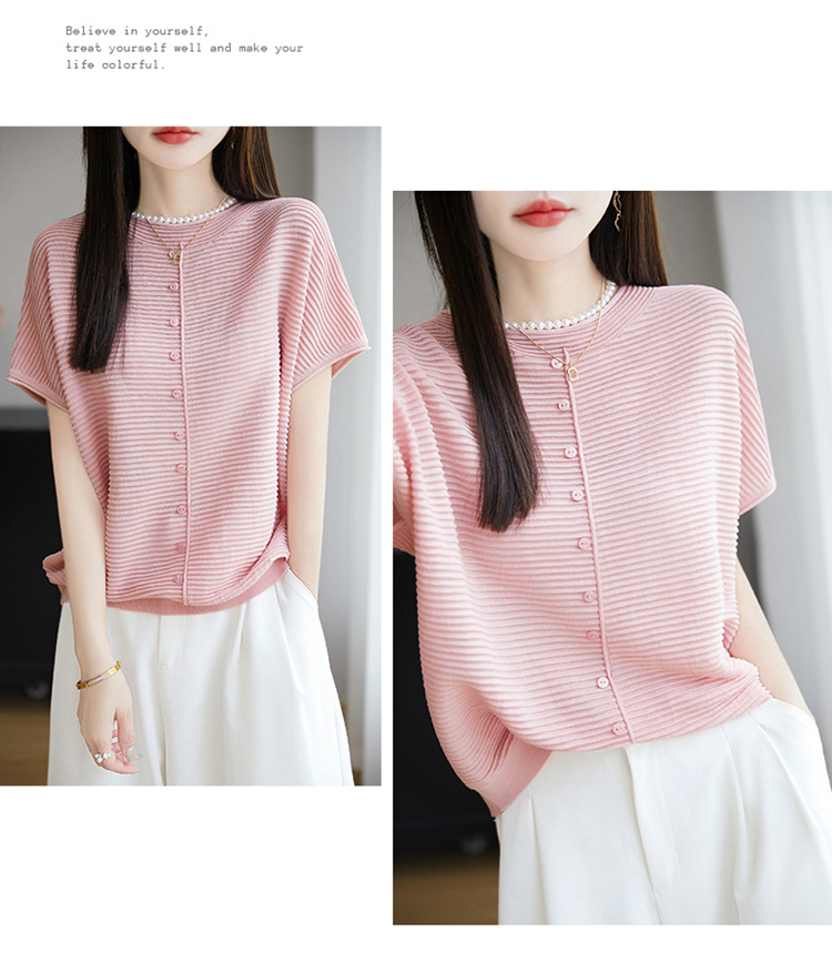 2025年新型洋気減齢レジャー天糸坑ボタン飛袖上着女性薄手ニット半袖tシャツ