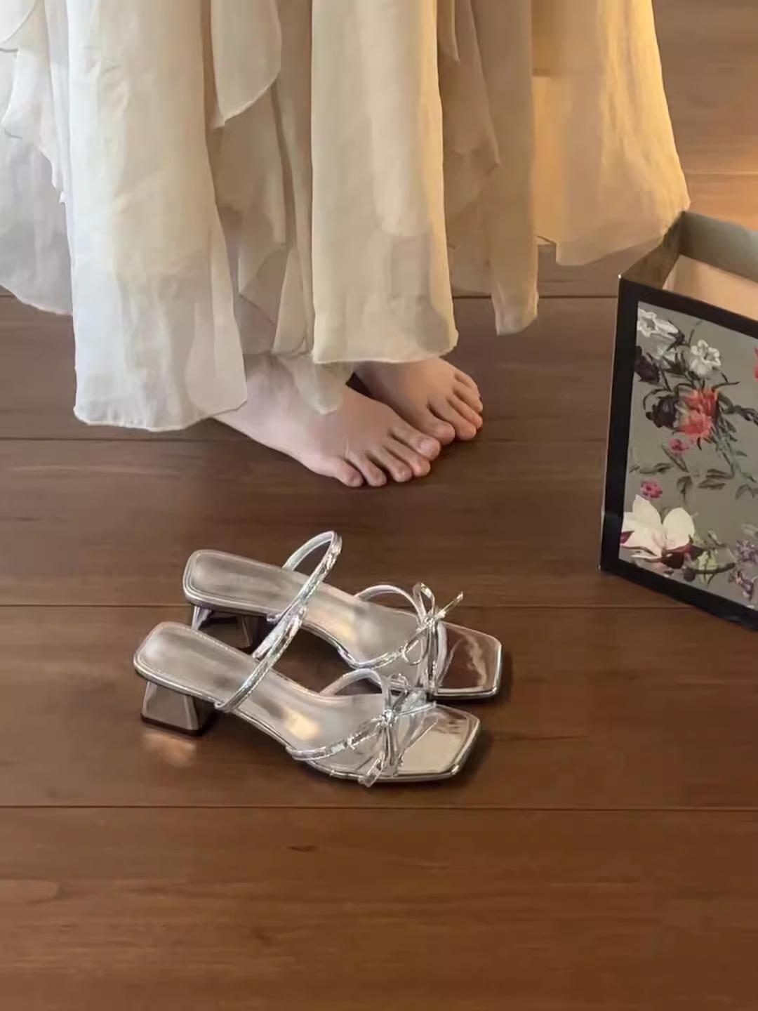 フランスのハイヒールのスリッパの女性2025年の新型の夏の外は方の頭の太さと1字の引きずる気質の蝶結びのサンダルを着ます。