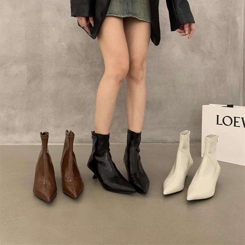 黒のポインテッドトゥハイヒールスリムブーツ女性のための 2024 秋と冬の新しいスタイルの小柄なデザインのスティレットスリムブーツ