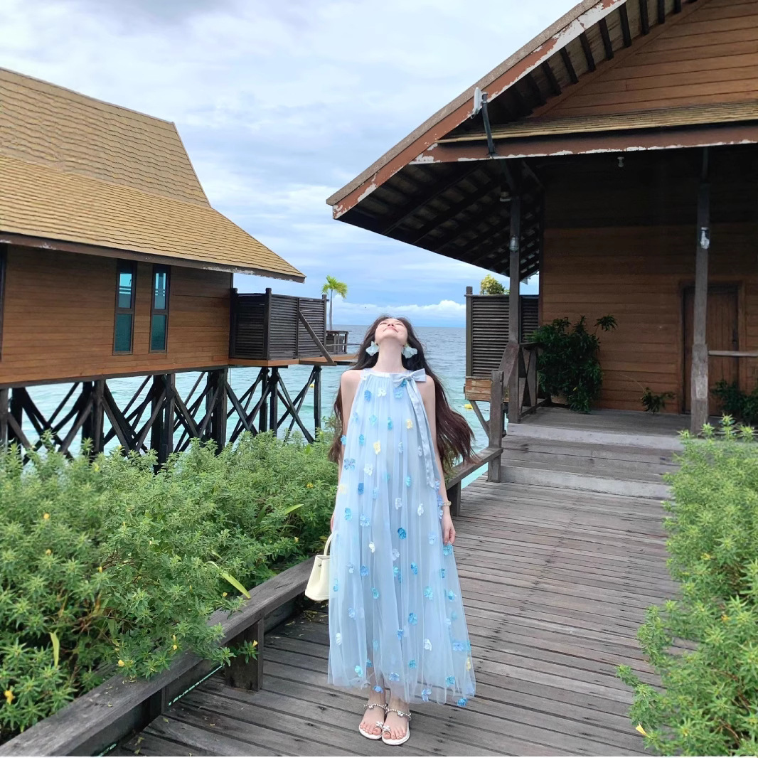 ブルーフレンチフラワーノースリーブホルターネックドレス女性のための 2025 夏の新しい海辺の休暇スタイル甘い妖精のドレス