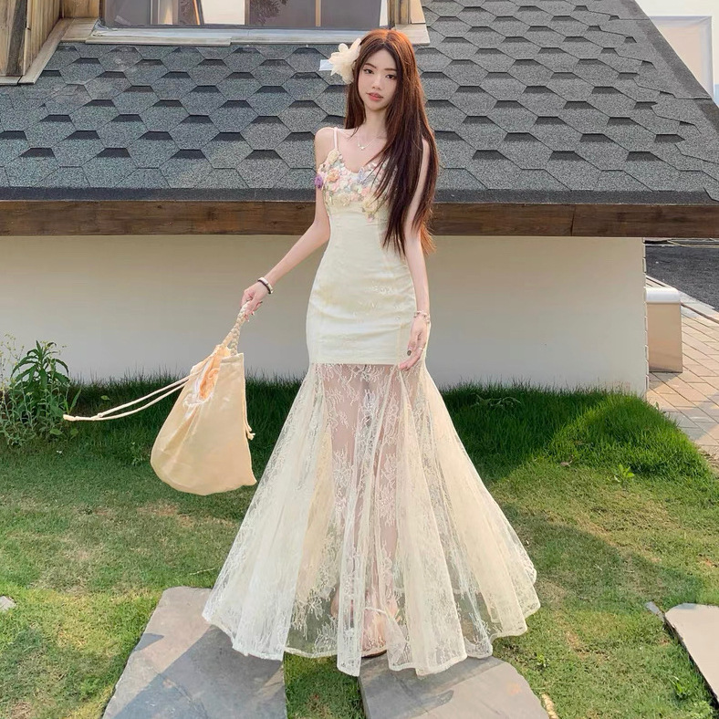 女性のためのニッチなライト高級サスペンダードレス 2025 新しいスタイルの海辺の休暇フリル気質ハイエンドフィッシュテールロングスカート