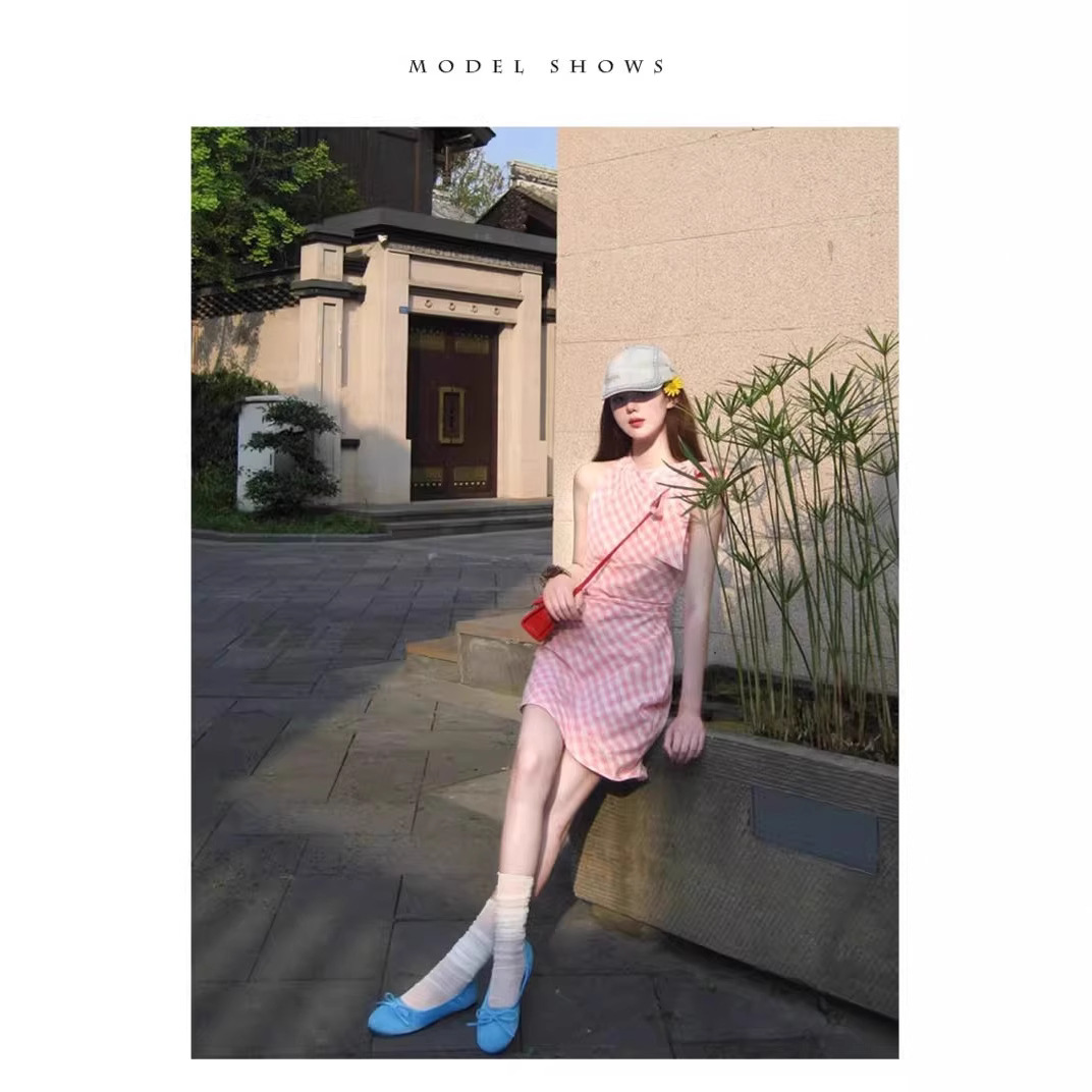 ピンクの格子縞の首の袖なしのワンピースの女性の夏の2025新型の高級感の小さい大衆の甘い脱走する王女のスカート