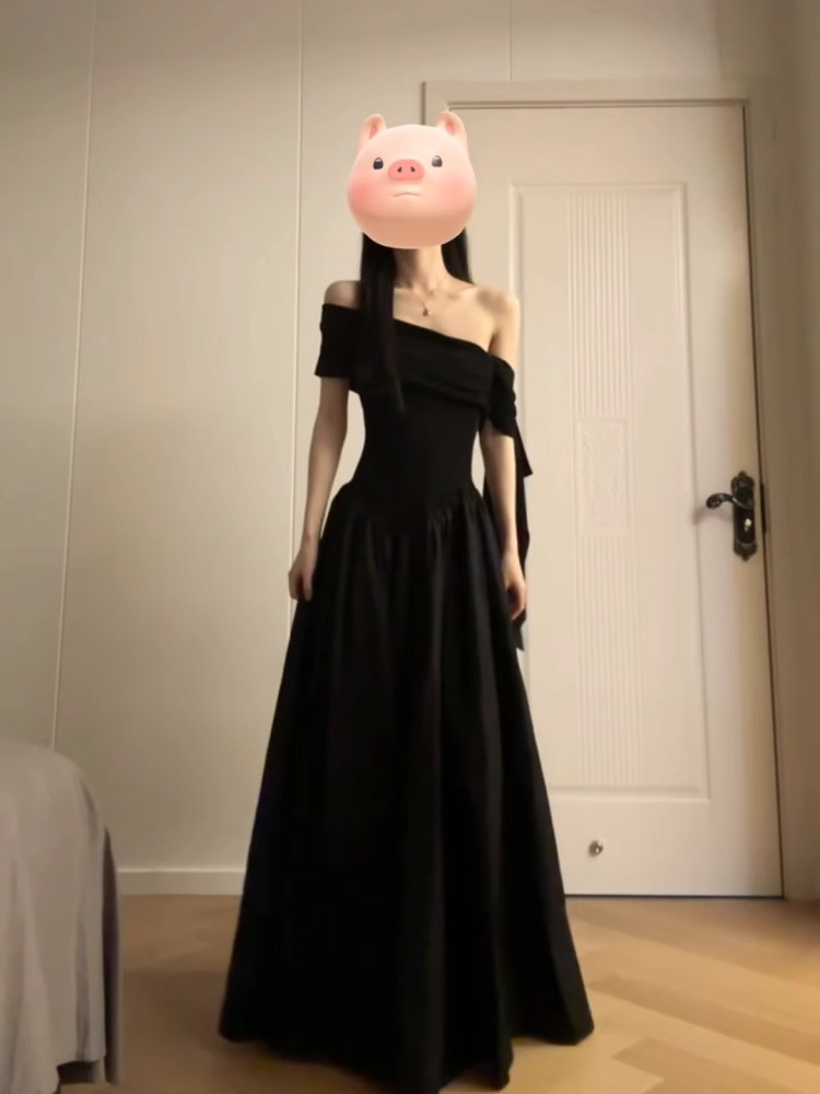 フレンチヘップバーンスタイルのワンショルダーリボン大きなスカート黒のドレス女性のための夏の新しいスタイル痩身気質ロイヤルシスター