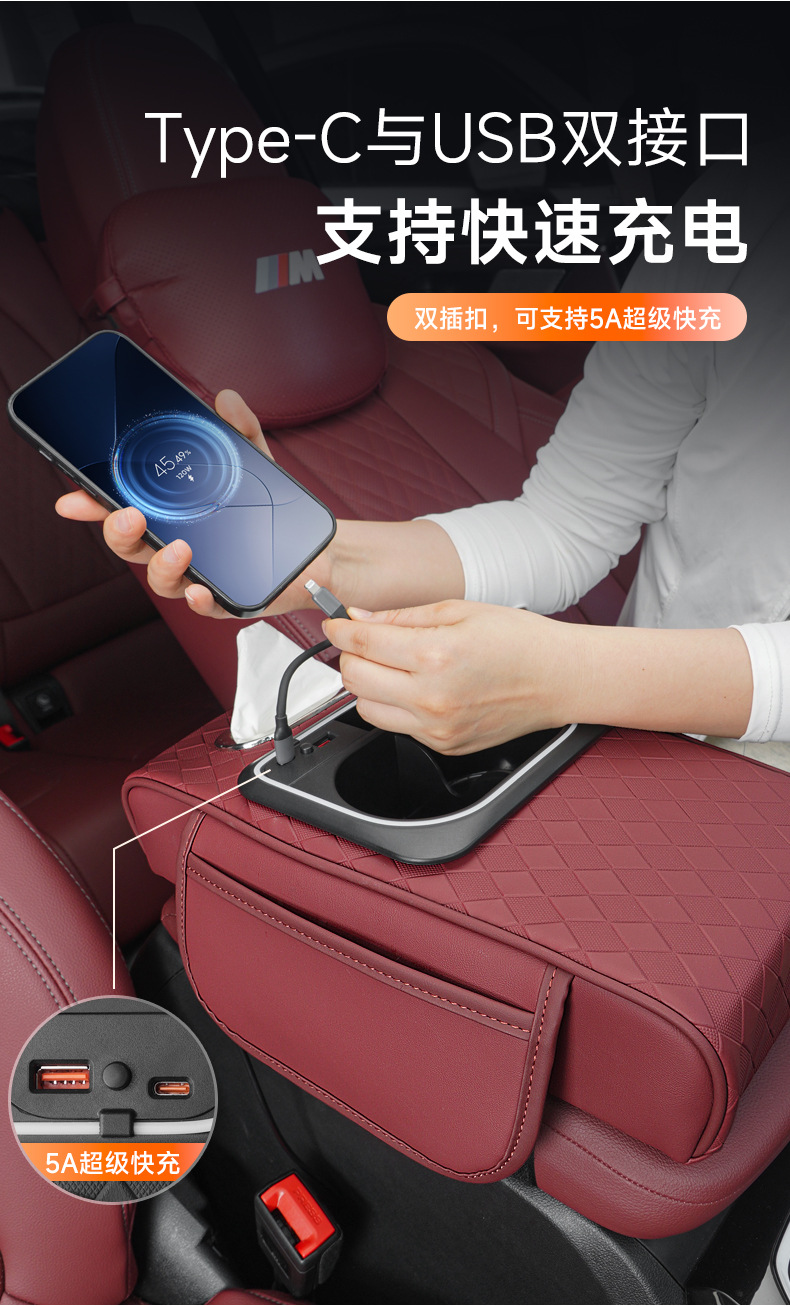車載手すり収納ボックス収納ボックス高級感ティッシュボックス付きコップホルダー携帯電話中央手すり増高パッド