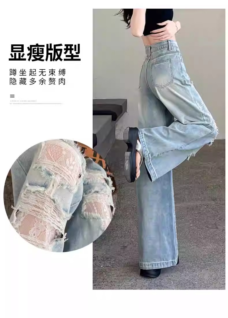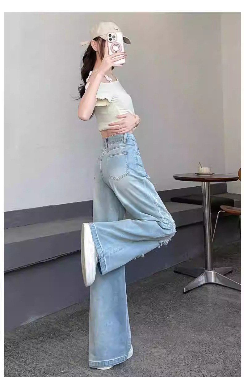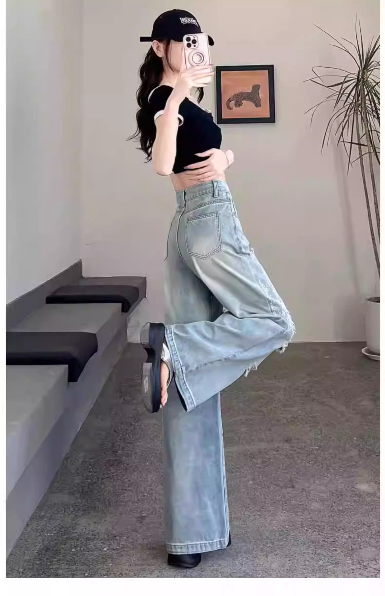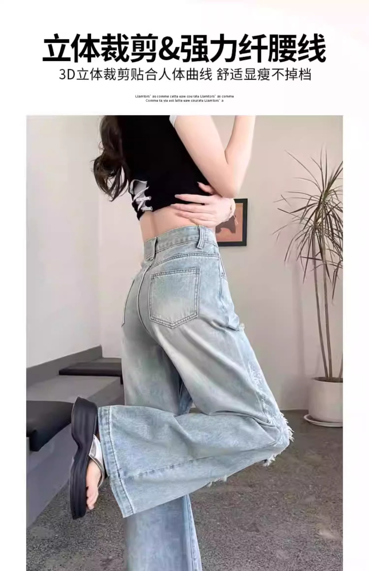 ゆったりとした広脚のラッパのジーパンの女性2025の新型の春の服の双ボタンの高い腰の立体は小さい背の小さいレギンスをつなぎ合わせます。