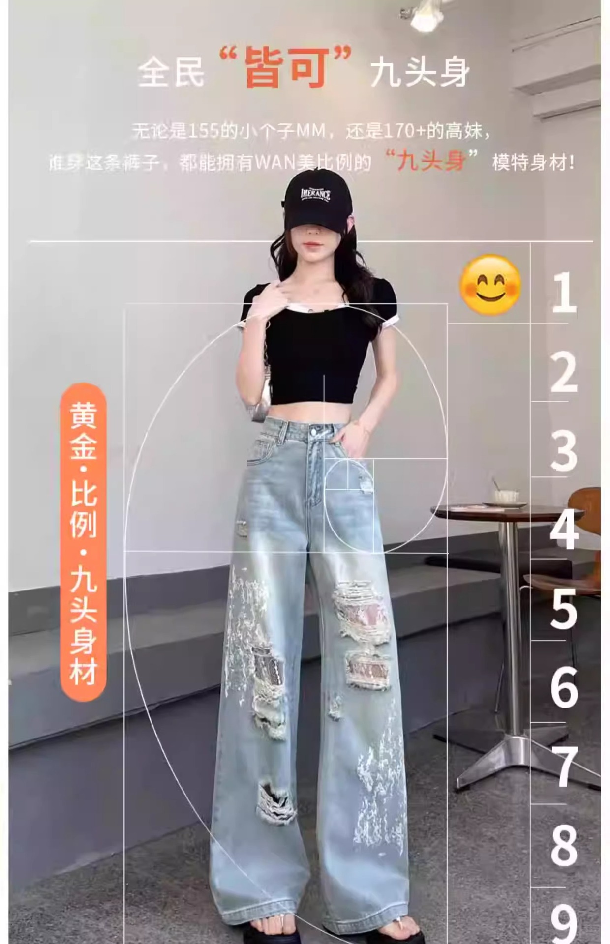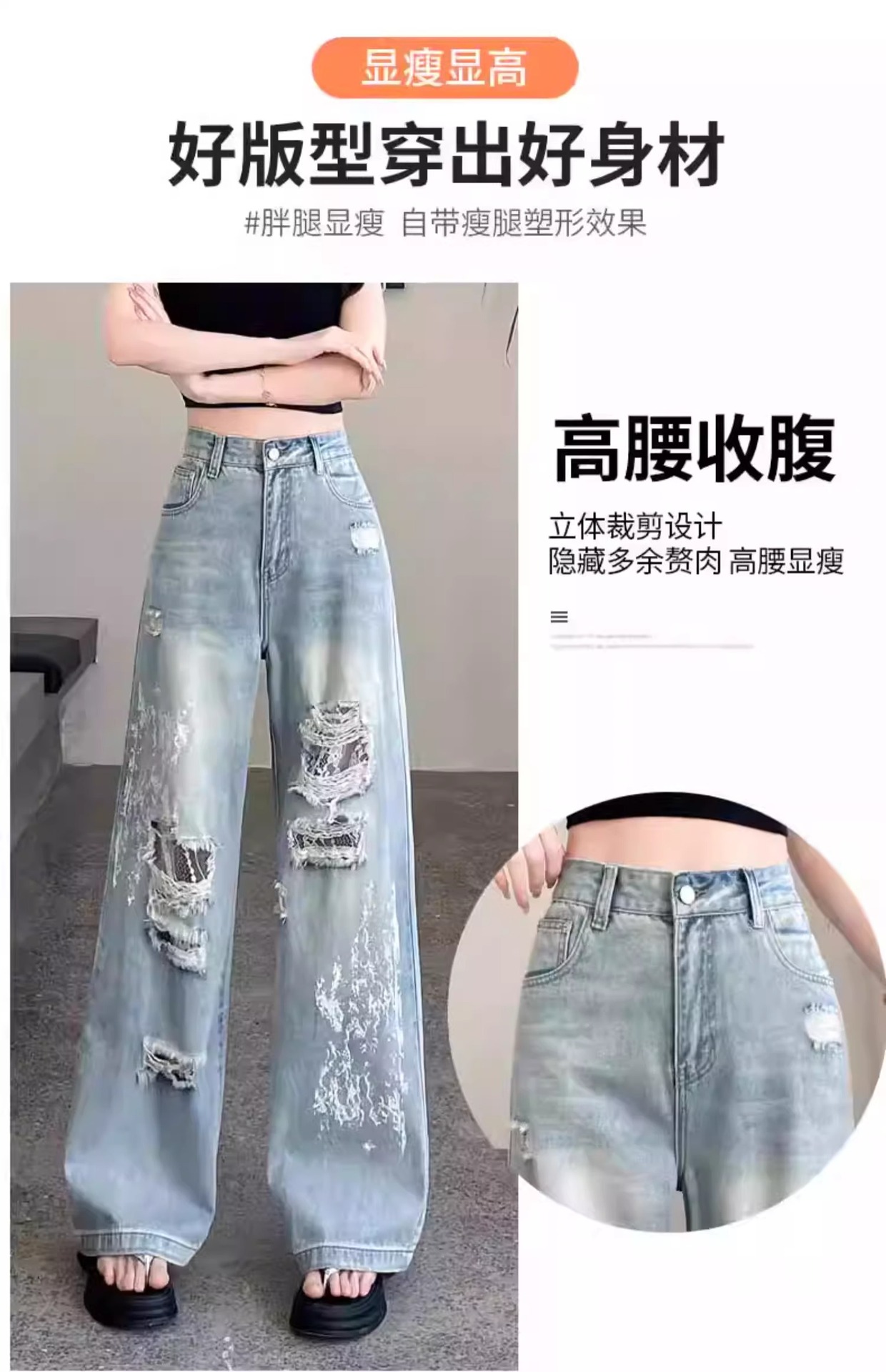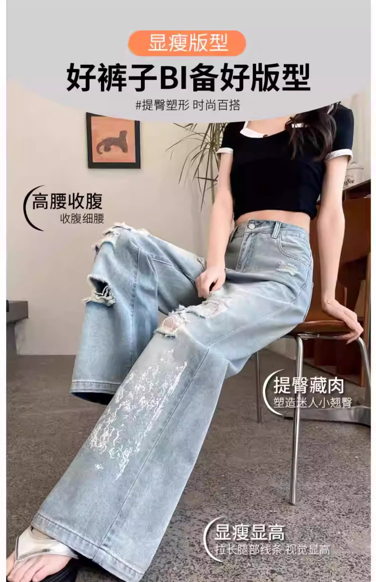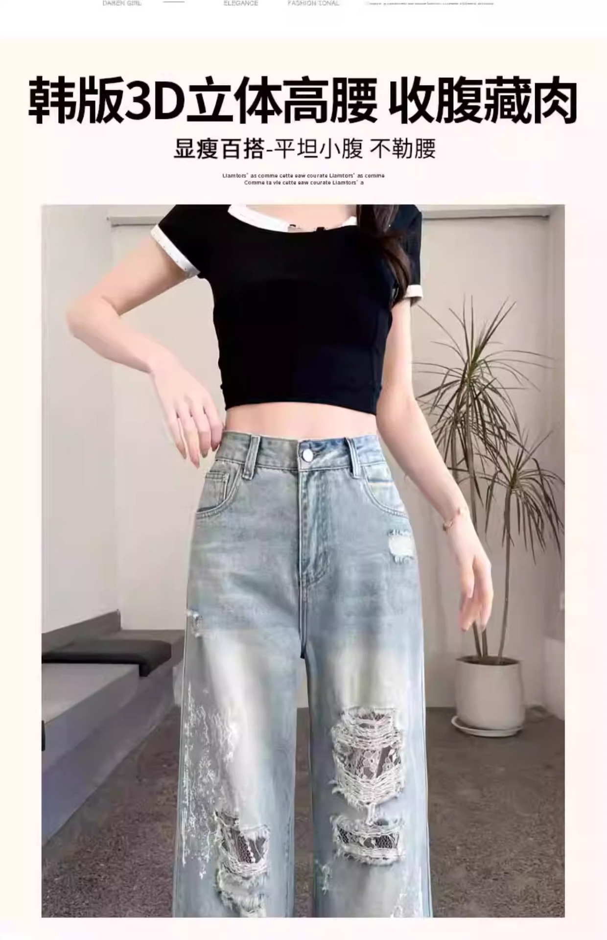 ゆったりとした広脚のラッパのジーパンの女性2025の新型の春の服の双ボタンの高い腰の立体は小さい背の小さいレギンスをつなぎ合わせます。