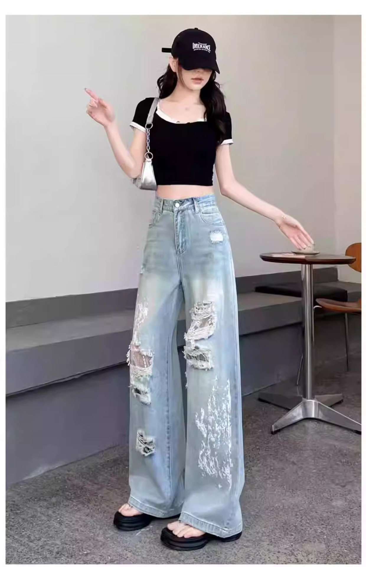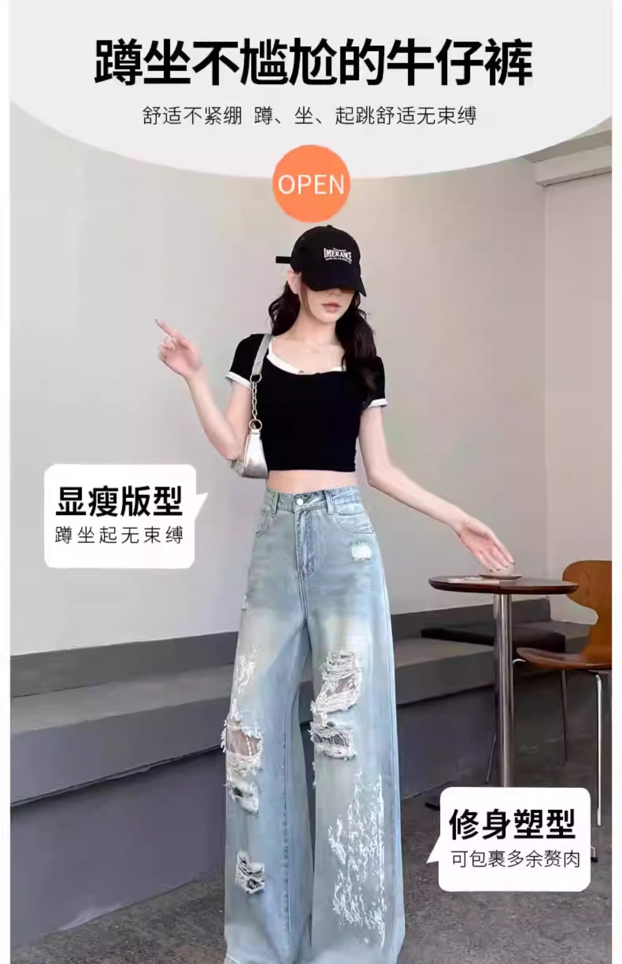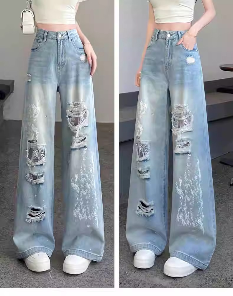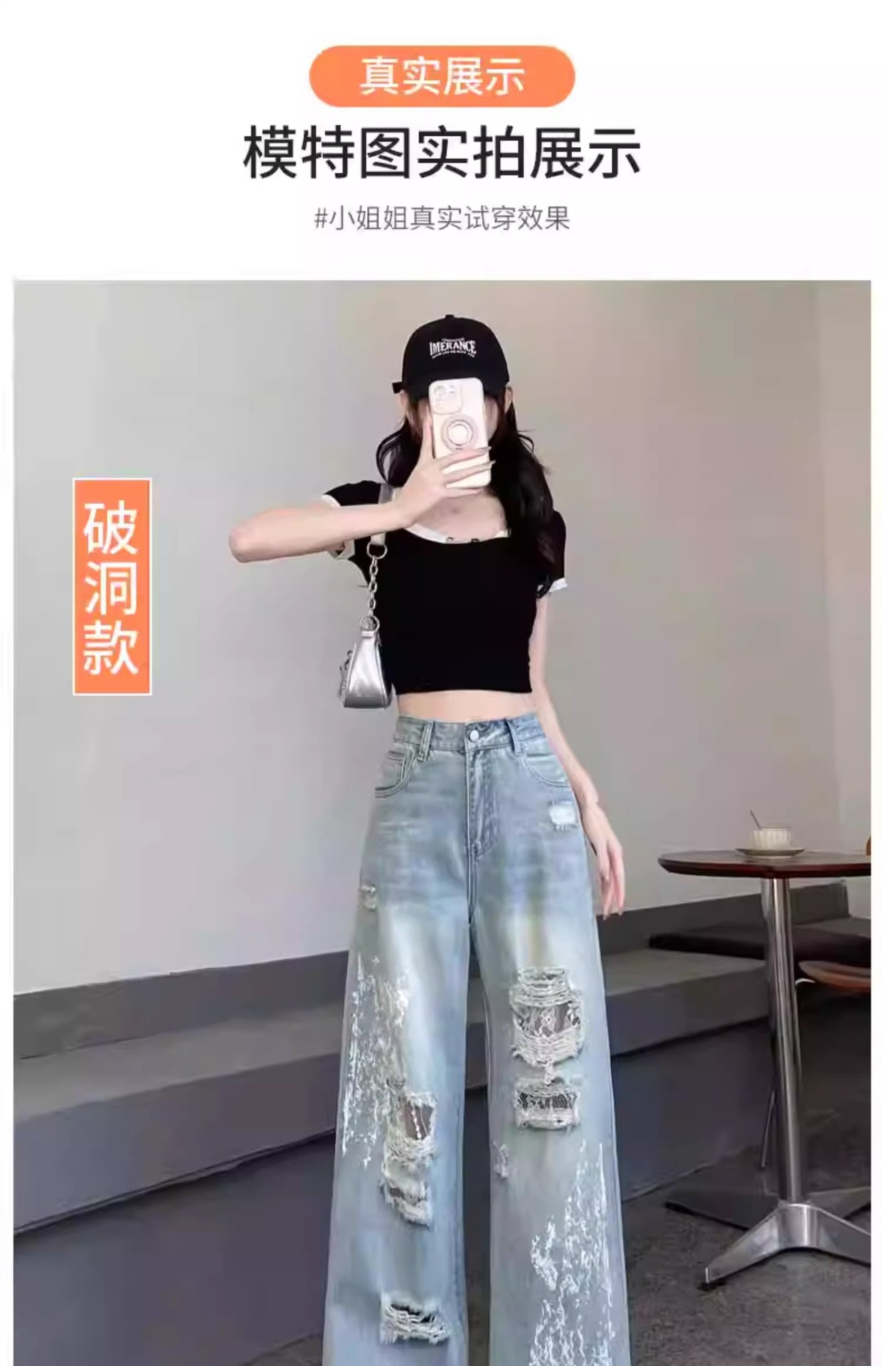 ゆったりとした広脚のラッパのジーパンの女性2025の新型の春の服の双ボタンの高い腰の立体は小さい背の小さいレギンスをつなぎ合わせます。