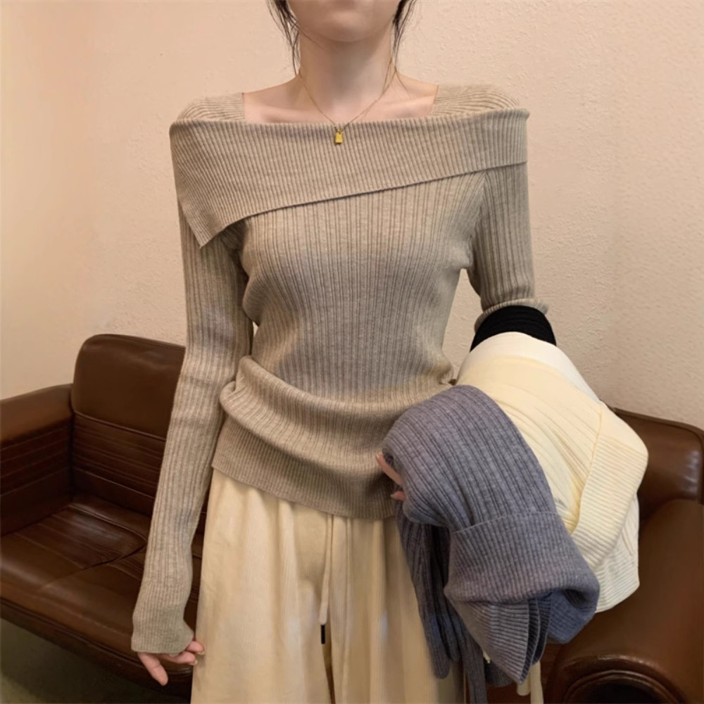一字の肩のニットの底のシャツの女性の春と秋冬の不規則な中にフランス式の高腰の正肩の鎖骨の長袖の上着を掛けます。