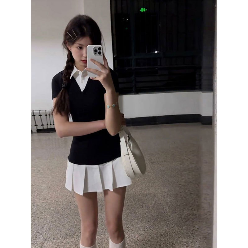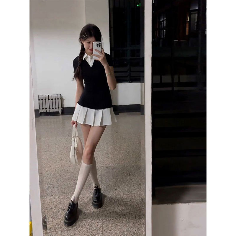 Chenling 夏新作カレッジスタイルカジュアルフェイクツーピースポロカラープリーツドレススリムフィット A ラインスカート