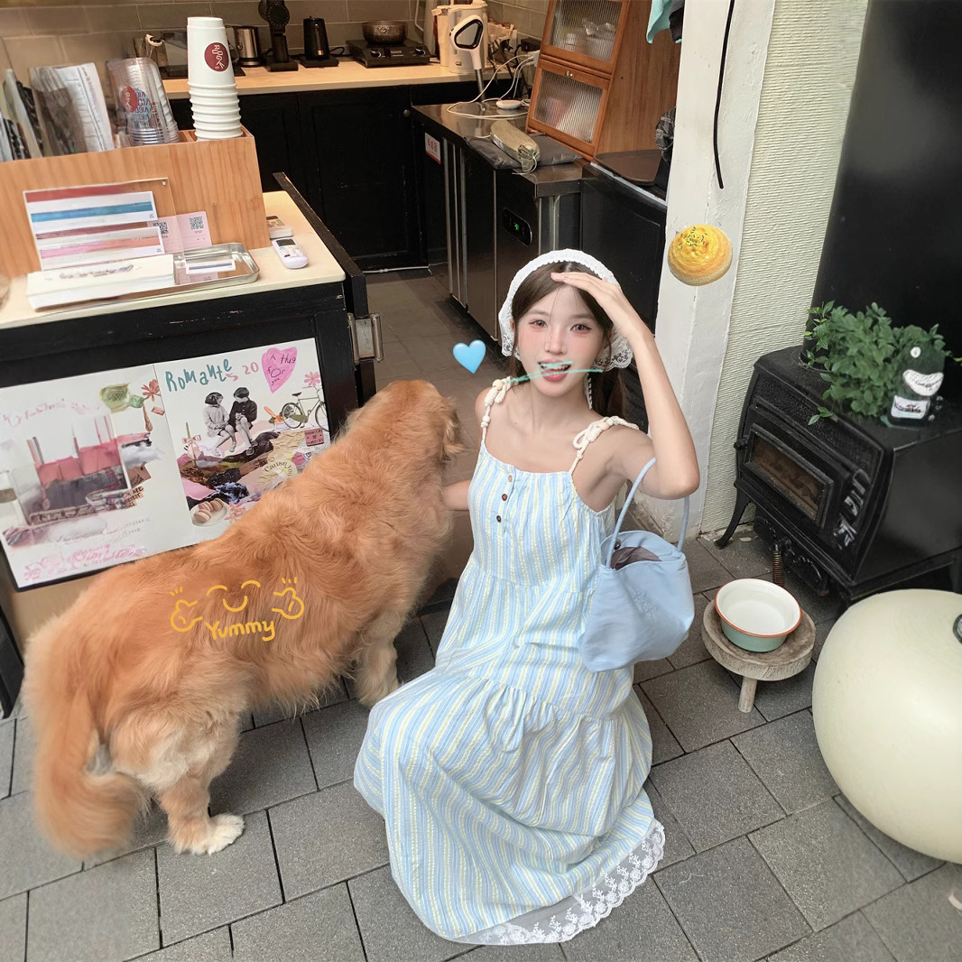 海辺の休暇のストライプのストラップのワンピースの子供2025夏の新型のフランスの気質のゆったりしている小さいスカート