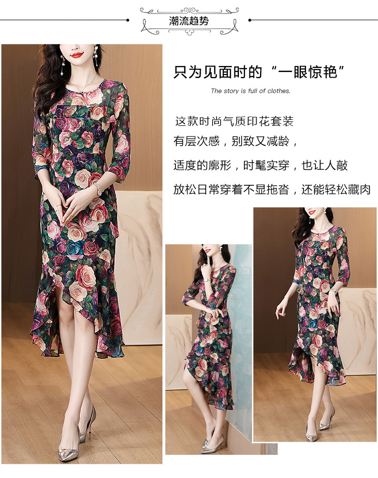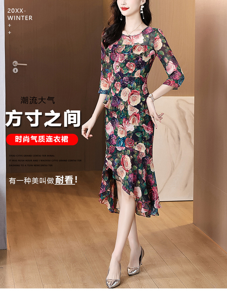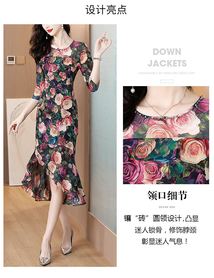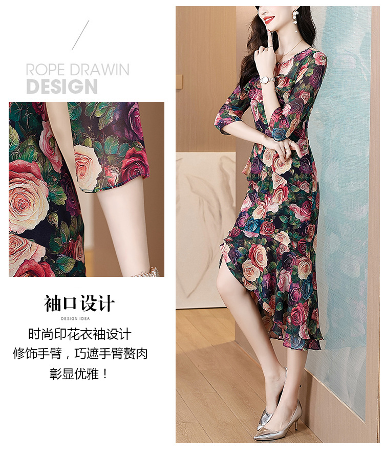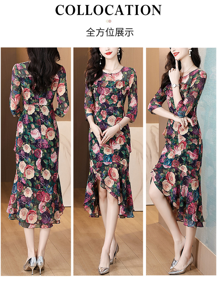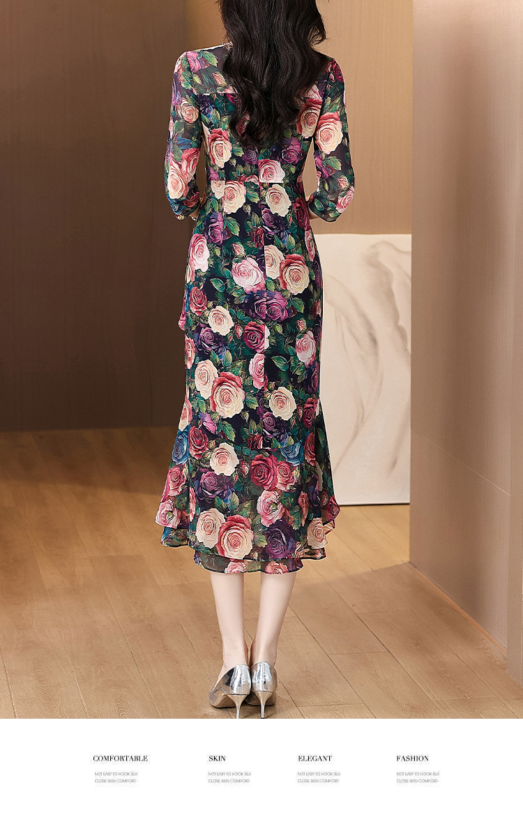Zyfs 3928バラのプリントのワンピースの女性2025夏の新型の高級感のフランス式のレトロな修身の魚尾のスカート