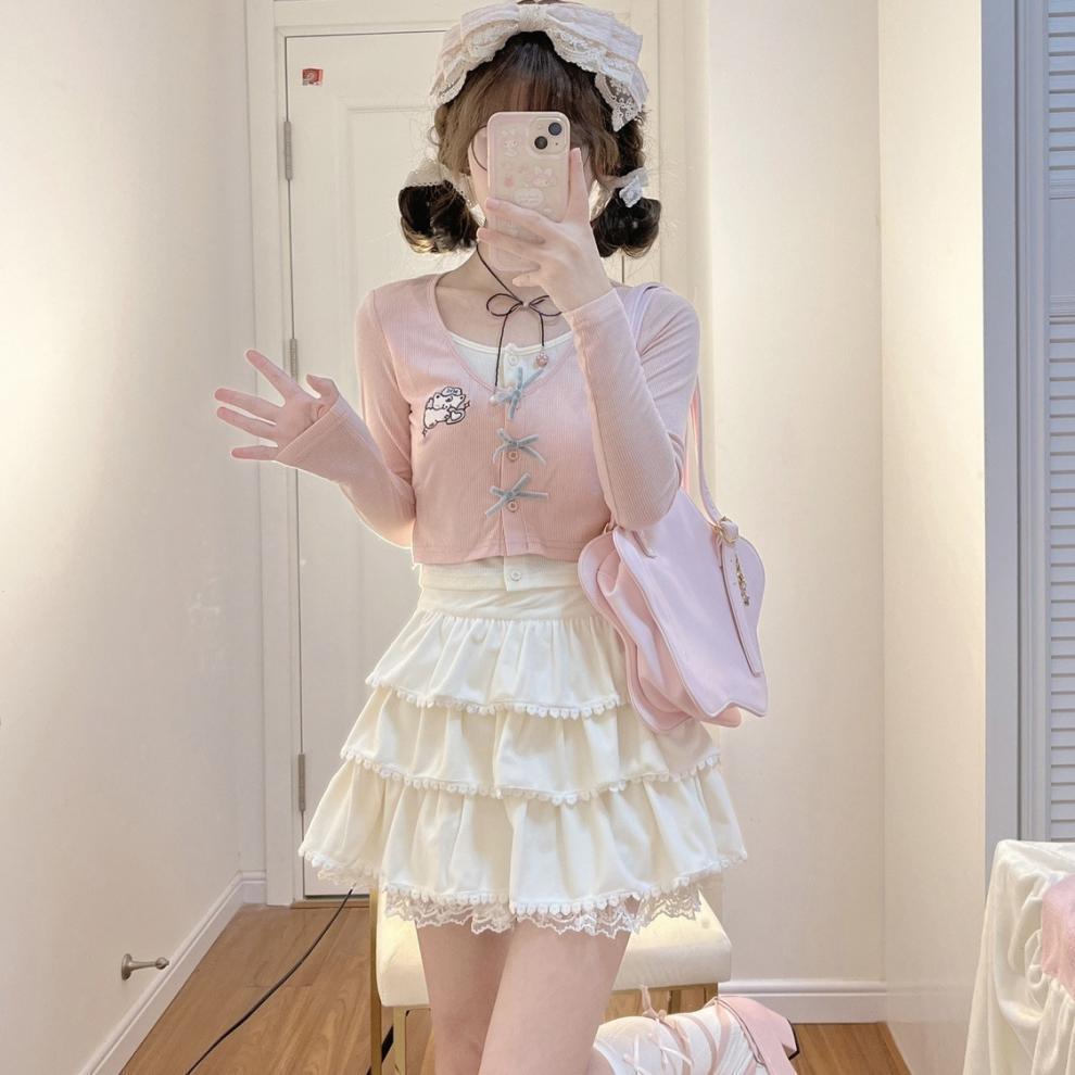 シングルピース/スーツ2025春夏スイートホットガールフェイクツーピースピンク長袖トップ+ハイウエストケーキスカート2点セット