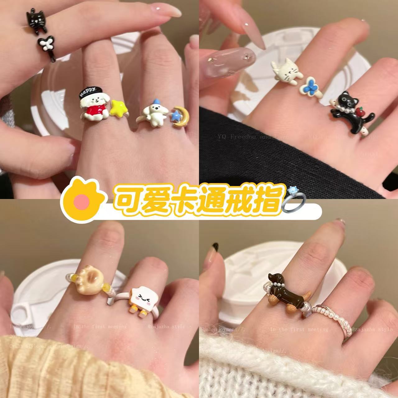 子供のような可愛いかわいい子猫の釉薬リング女性のニッチデザインオープン調節可能な人差し指リング漫画甘いリング