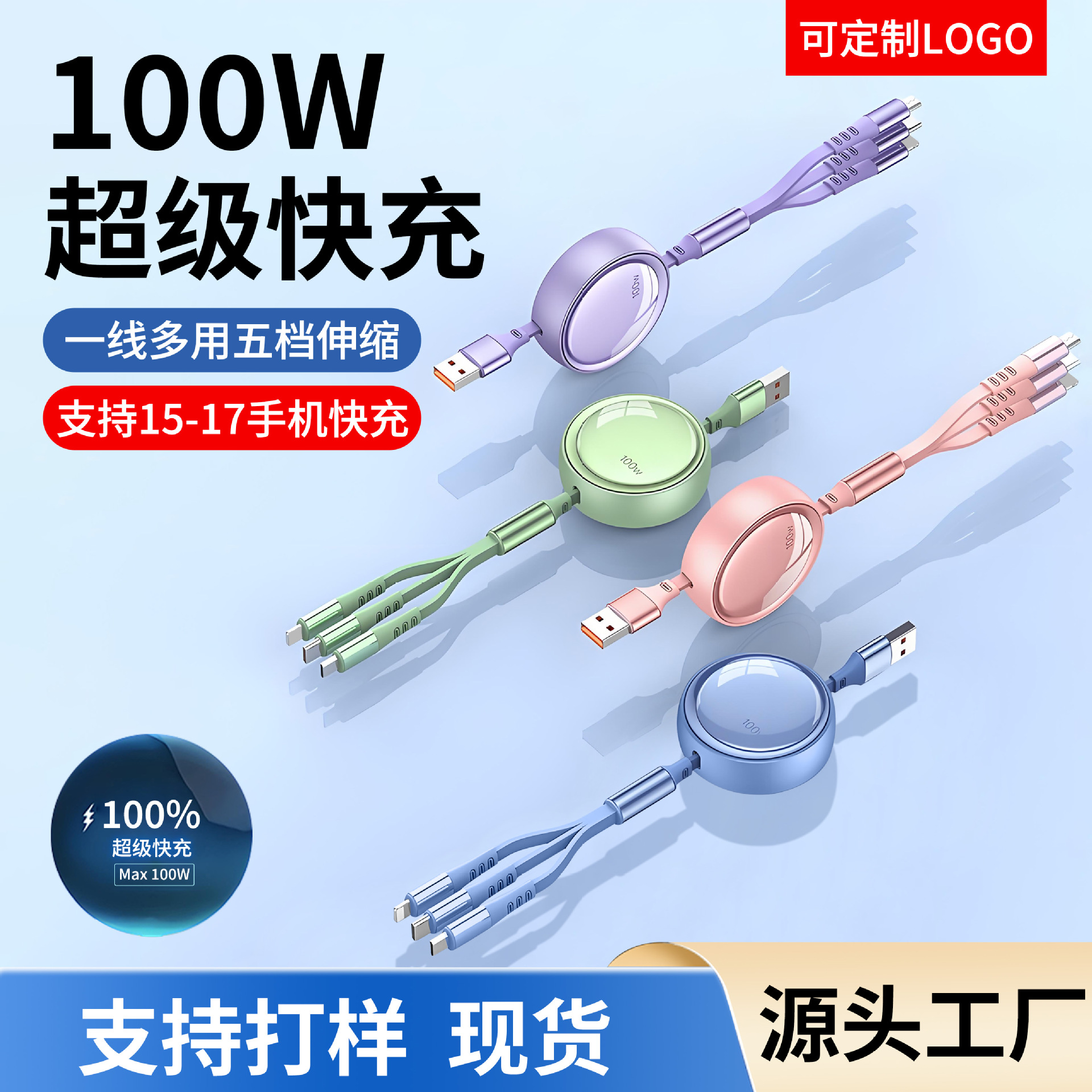 100w超快充三合一伸縮ケーブルはアップル華為安卓usbフラッシュ充電車載typecを適用する